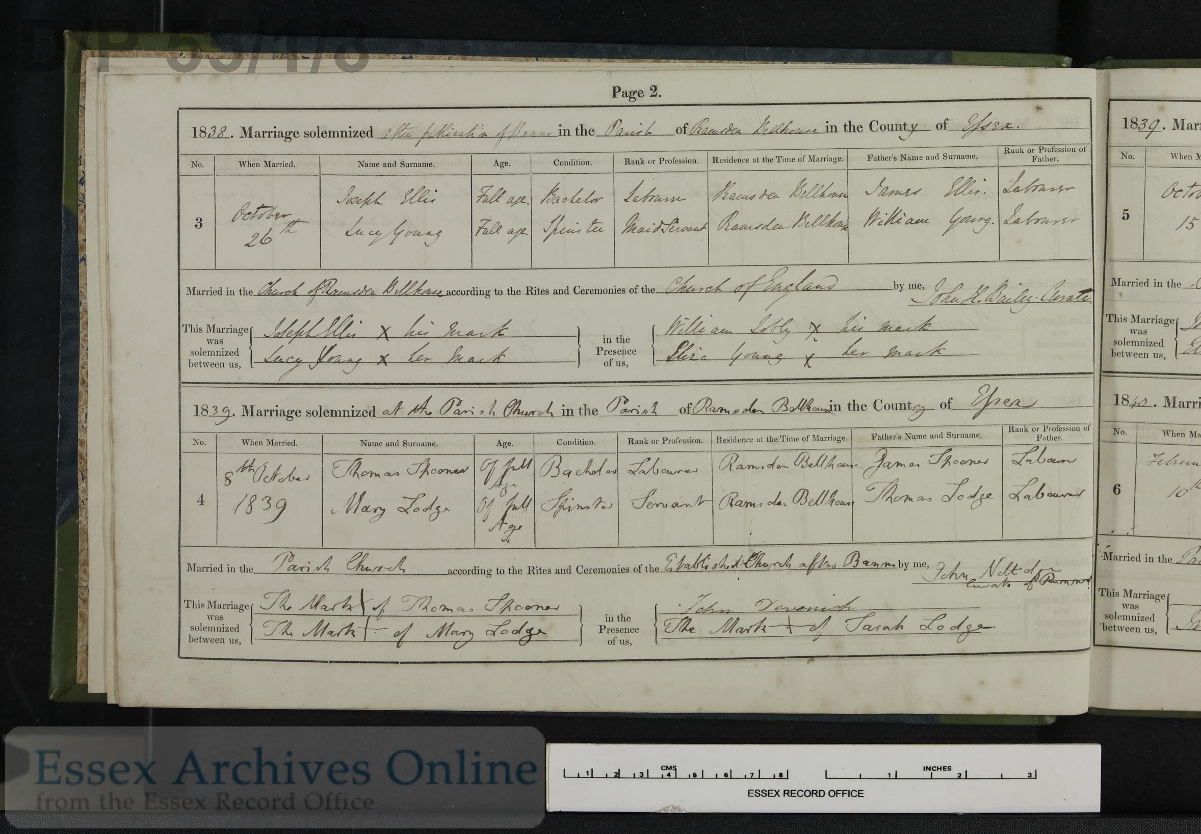 Parish Registers of St Mary the Virgin, Ramsden Bellhouse, Essex; Marriage entry for Joseph Ellis and Lucy Young, 26 Oct 1838, Page 2, No 3.