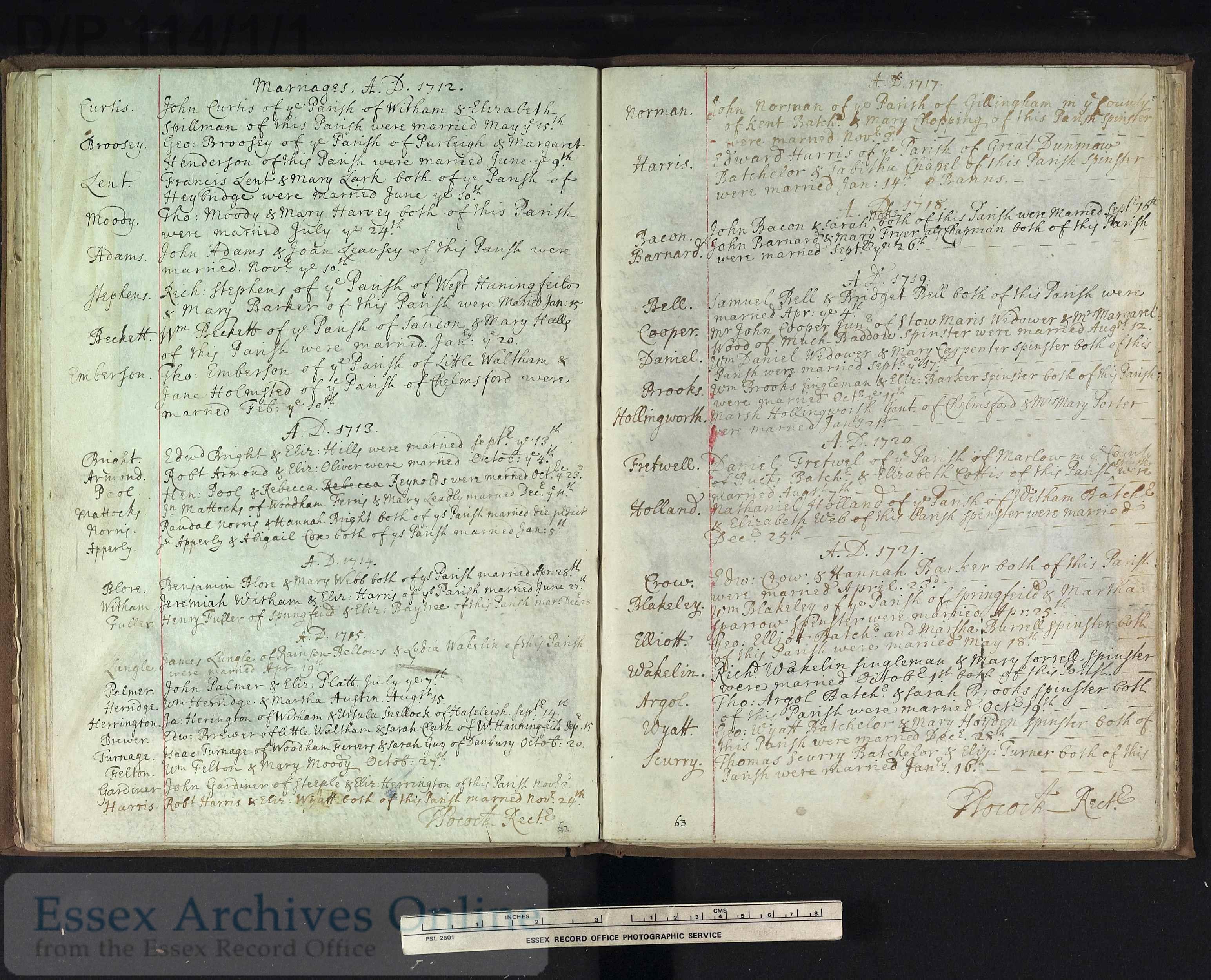 Parish Registers of St. John the Baptist, Danbury, Essex, England; Marriage of Wm Felton and Mary Moody, 27 Oct 1715.