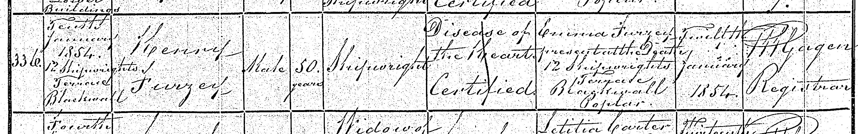 Death in the Registration District of Poplar, Middlesex, 1854, no. 336. Died 10 Jan 1854 at 12 Shipwrights Terrace, Blackwall; Henry Furzey; Male; age 50; Shipwright. Cause of death: Disease of the heart, certified. Informant was Emma Furzey (signed name); relation: Not known; residing at 12 Shipwrights Terrace, Blackwall, Poplar; present at death. The death was registered 12 Jan 1854.