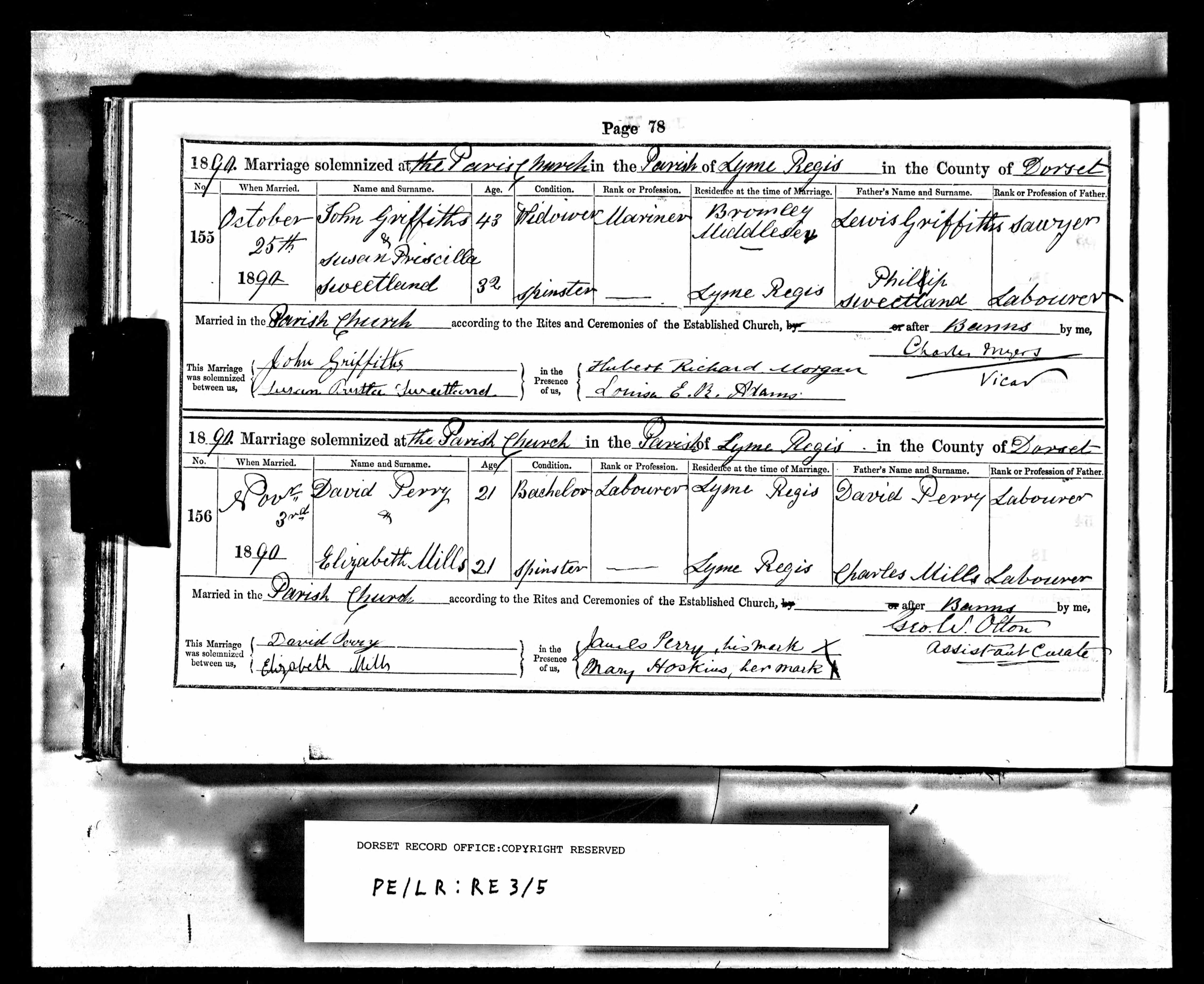 Parish Registers of St. Michael the Archangel, Lyme Regis, Dorset; Marriage entry for John Griffiths and Susan Priscilla Sweetland, 25 Oct 1890, Page 78, No 155.