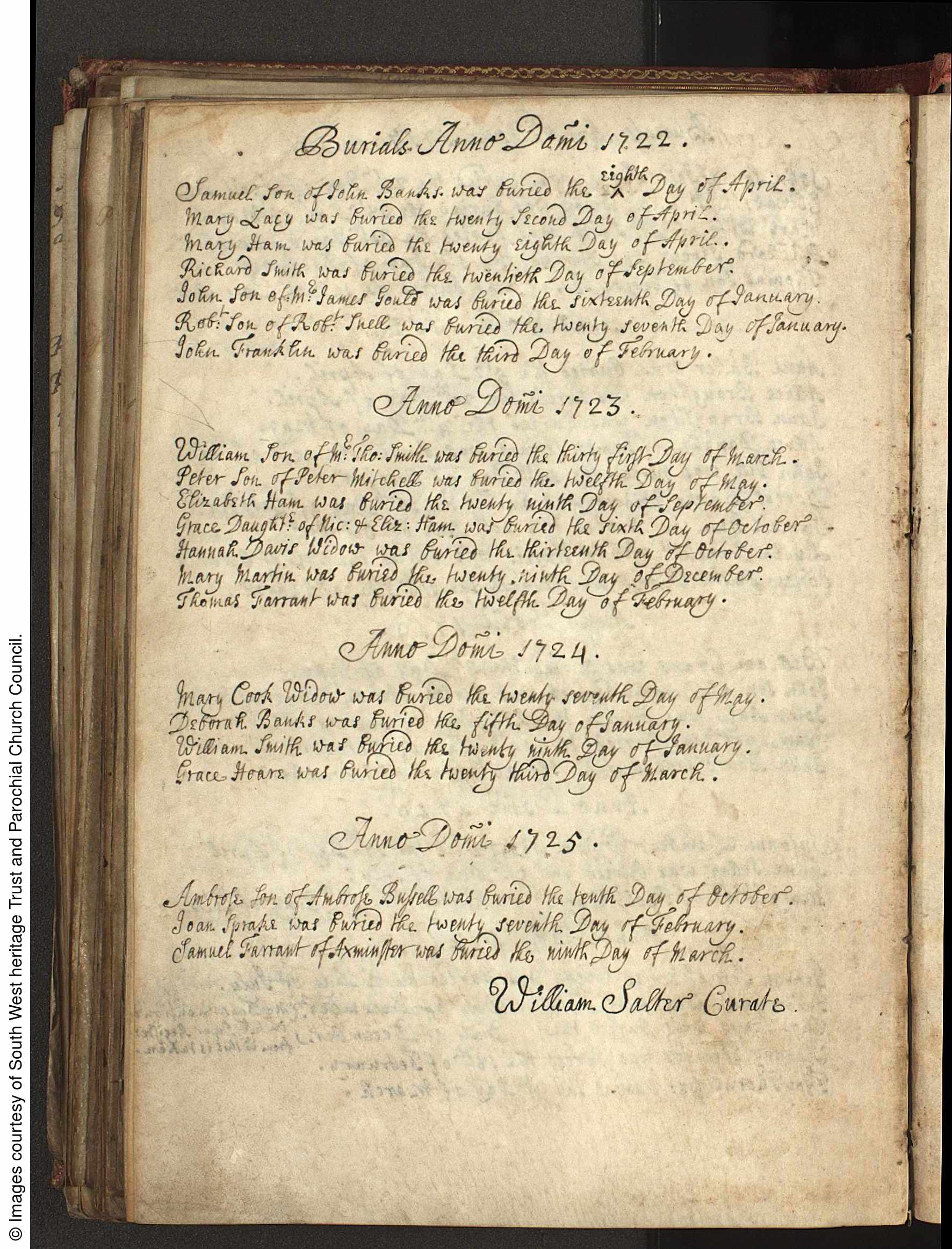 Parish Registers of St Michael, Shute, Devon; Burial entry for Thomas Farrant, 12 Feb 1723.