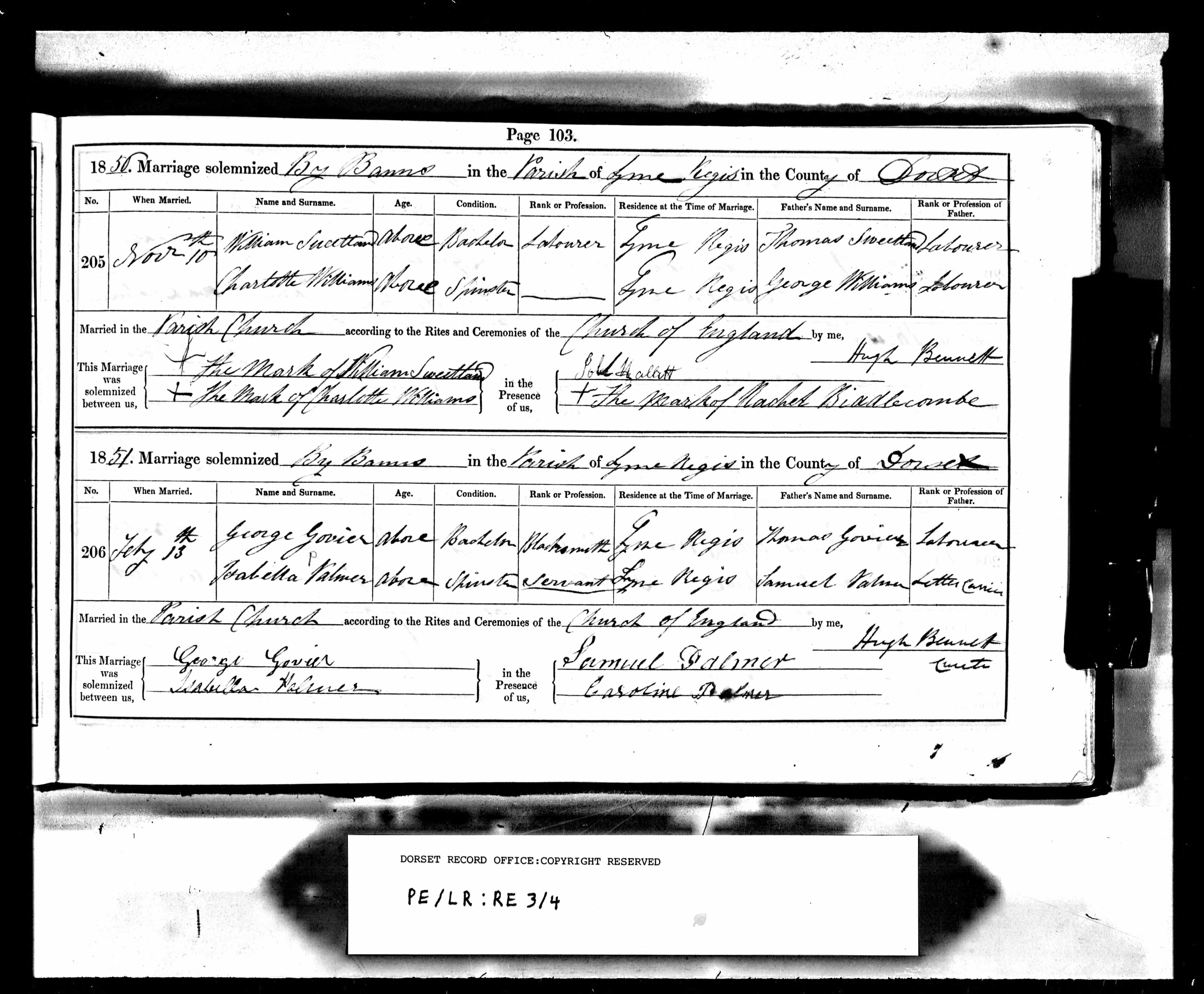 Parish Registers of St. Michael the Archangel, Lyme Regis, Dorset; Marriage entry for William Sweetland and Charlotte Williams, 10 Nov 1850, Page 103, No 205.