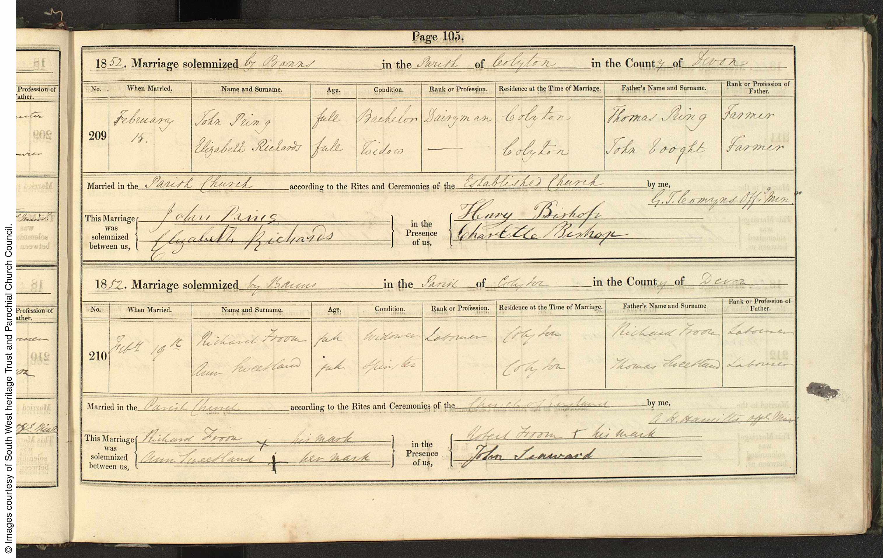 Parish Registers of St. Andrew, Colyton, Devon; Marriage entry for Richard Froom and Ann Sweetland, 19 Feb 1852, Page 105, No 210.
