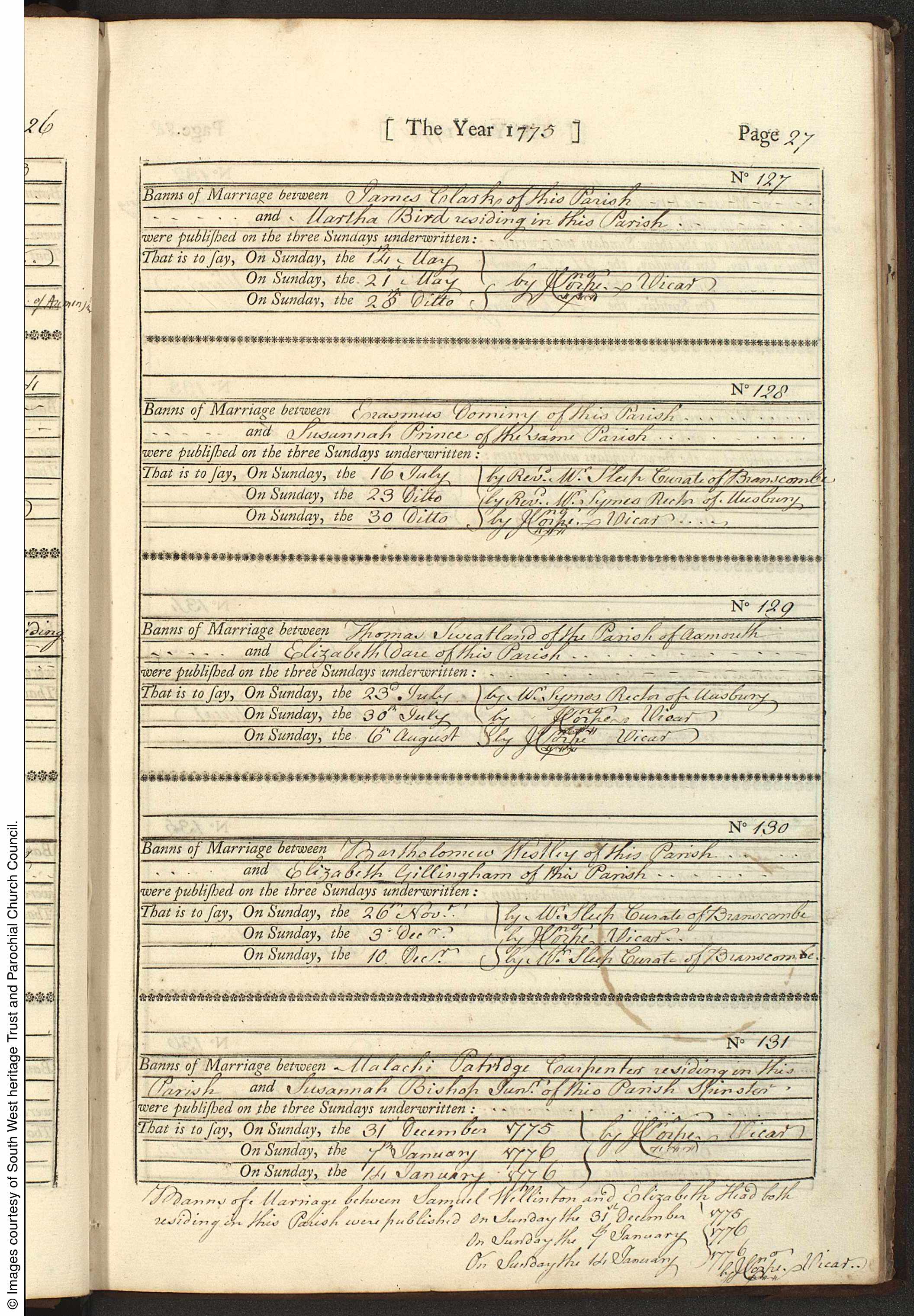 Parish Registers of St. Gregory, Seaton & Beer, Devon; Marriage Banns entry for Thomas Sweatland and Elizabeth Dare, 23 Jul, 20 Jul and 6 Aug 1775, Page 27. No 129.