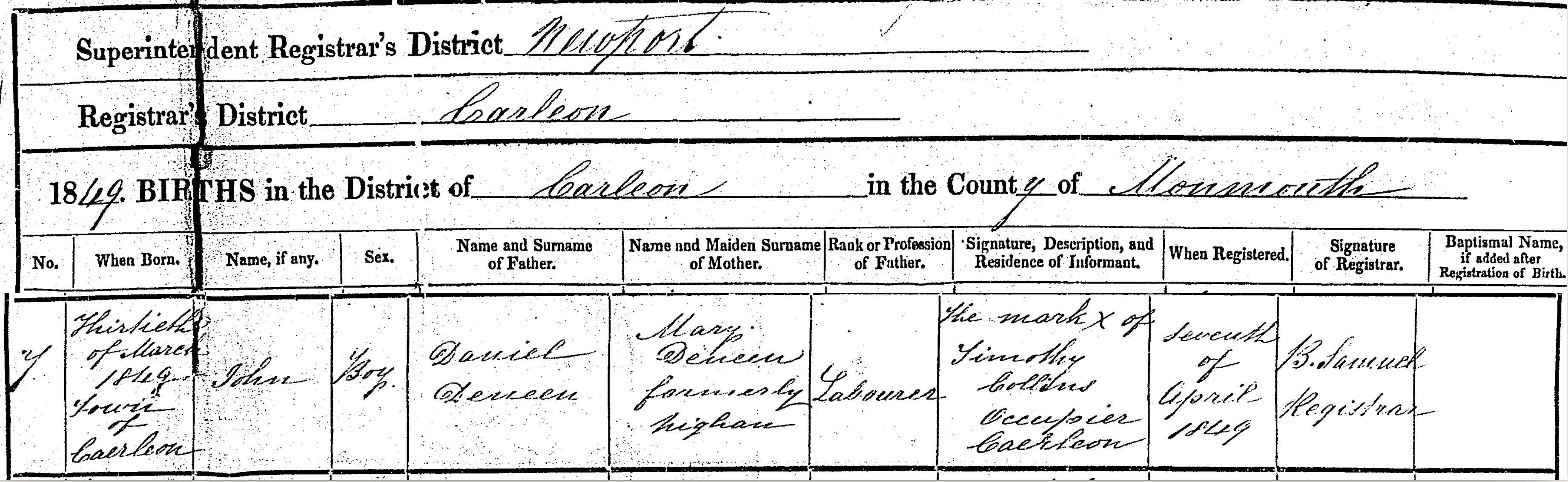 Birth in the Registration District of Newport, Sub-district of Caerleon, Monmouth, 1849, no. 7. Born 30 Mar 1849 at Town of Caerleon; John Deneen; Boy; father Daniel Deneen; mother Mary Deneen formerly Nighan. Occupation of father: Labourer. Informant was Timothy Collins; Occupier; Caerleon; could not sign name. The birth was registered 7 Apr 1849.