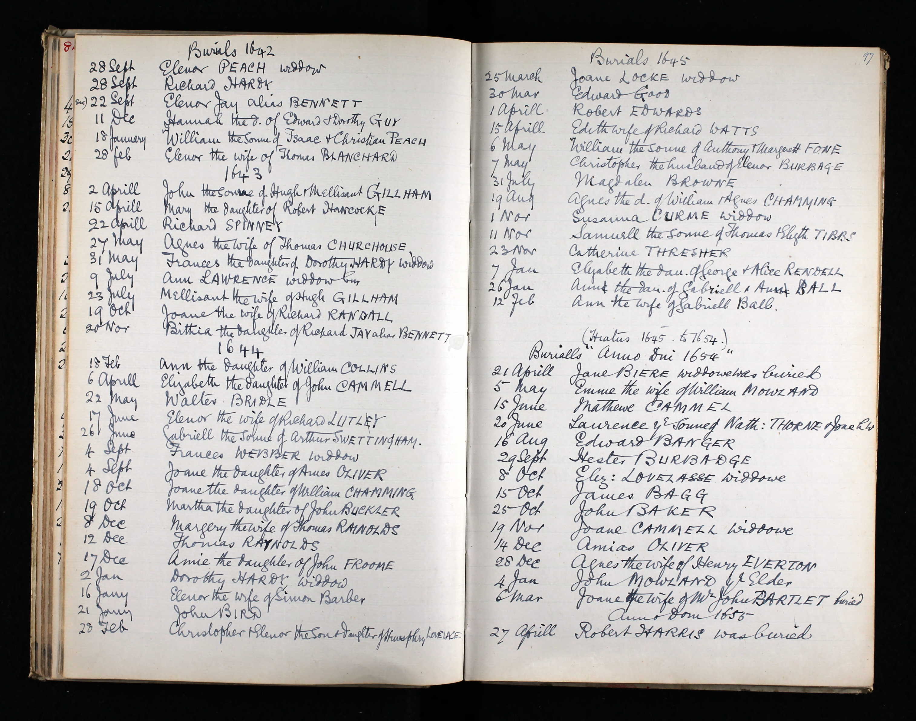 Transcription of burial entry for Elizabeth Lovelasse, 8 Oct 1654, Page 97