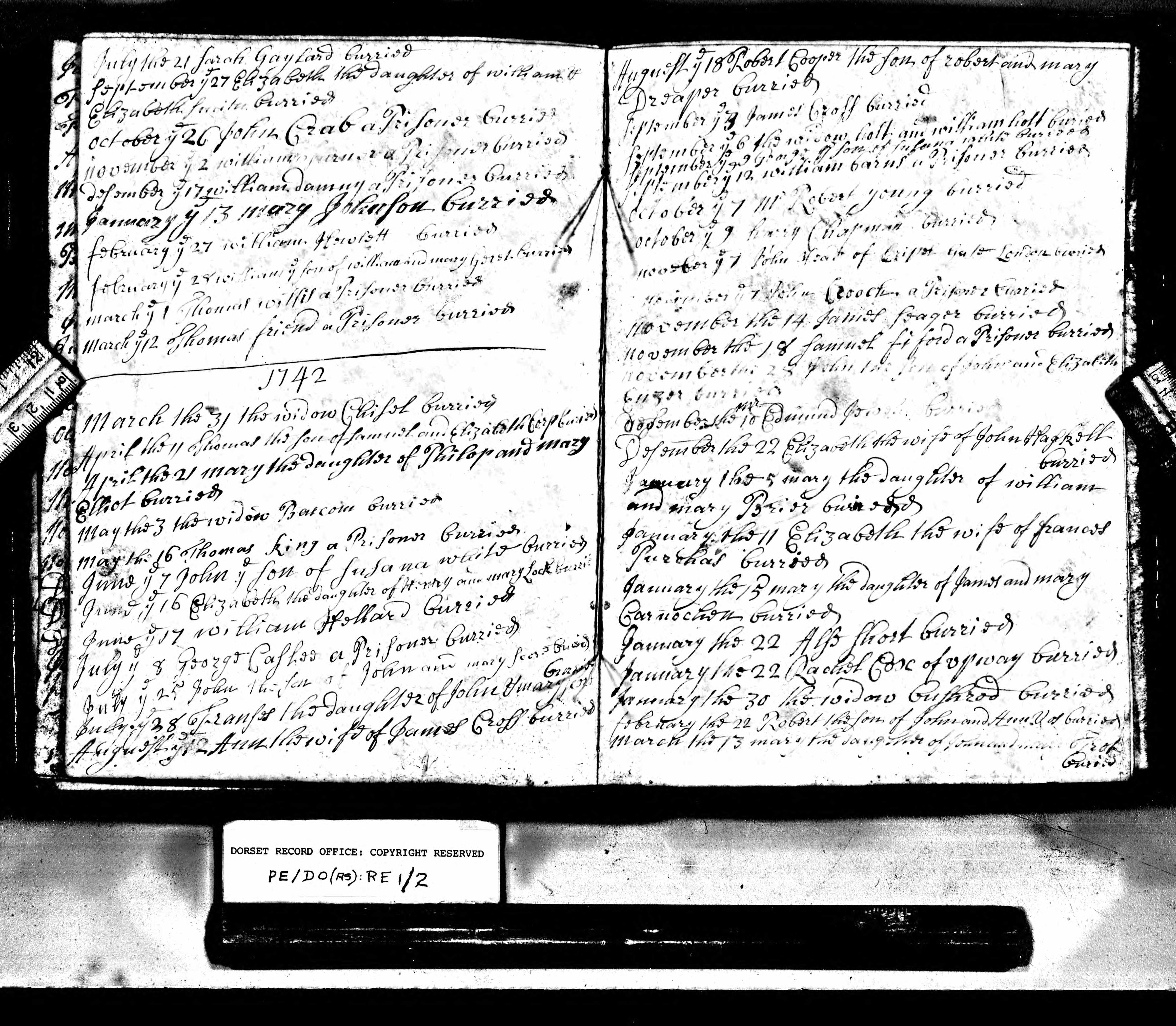 Parish Registers of All Saints, Dorchester All Saints, Dorset; Burial entry for Robert Vos, 22 Feb 1742.