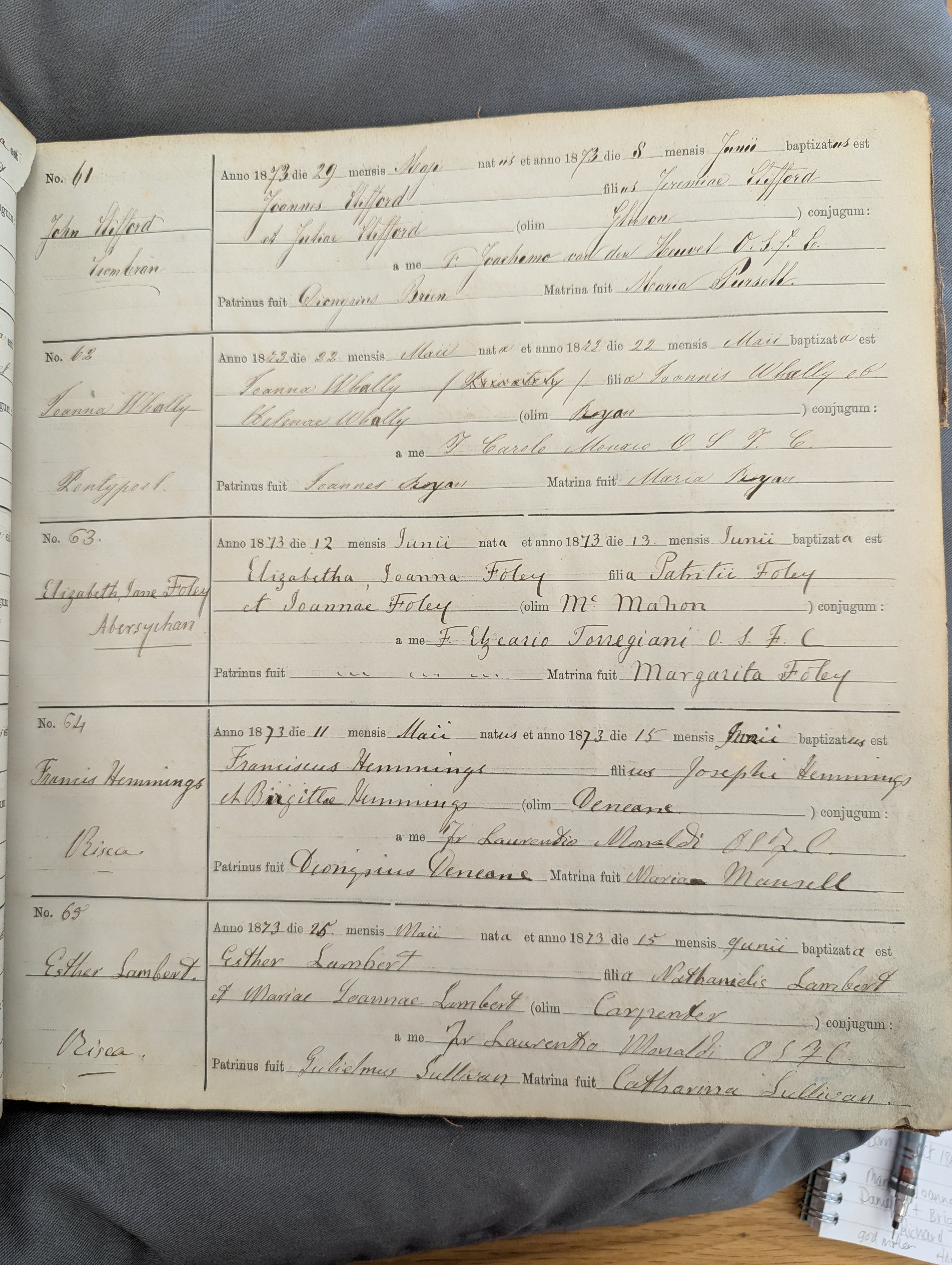 Church Registers of St. Alban, Pontypool, Monmouthshire; Baptism entry for Francis Hemmings, Risca, 15 Jun 1873, No 64.