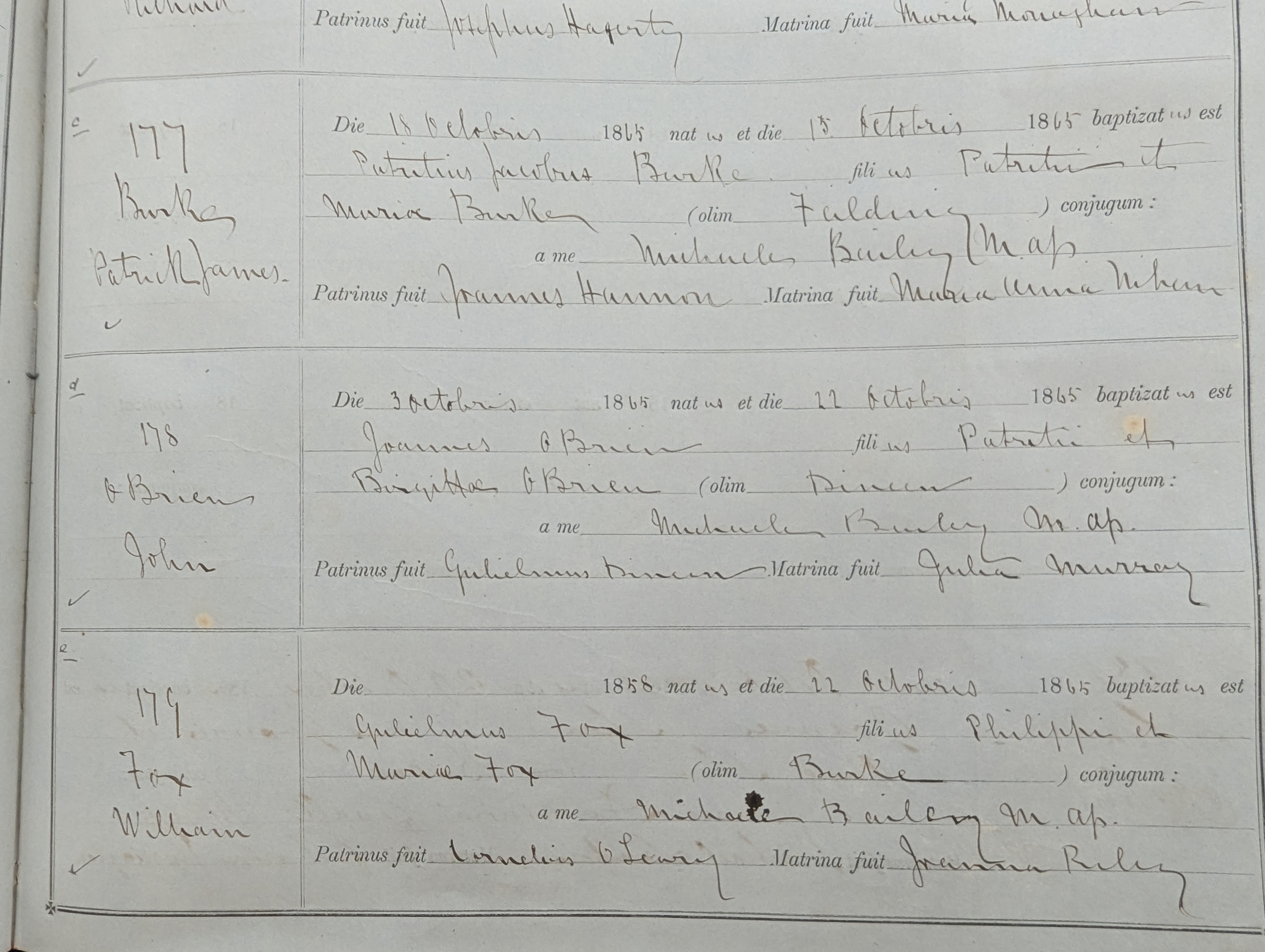 Joannis OBrien filius Patritii et Birgitta OBrien (olim Dineen). Patrinus fuiit Gulielimus Dineen. Matrina fuit Julia Murray.