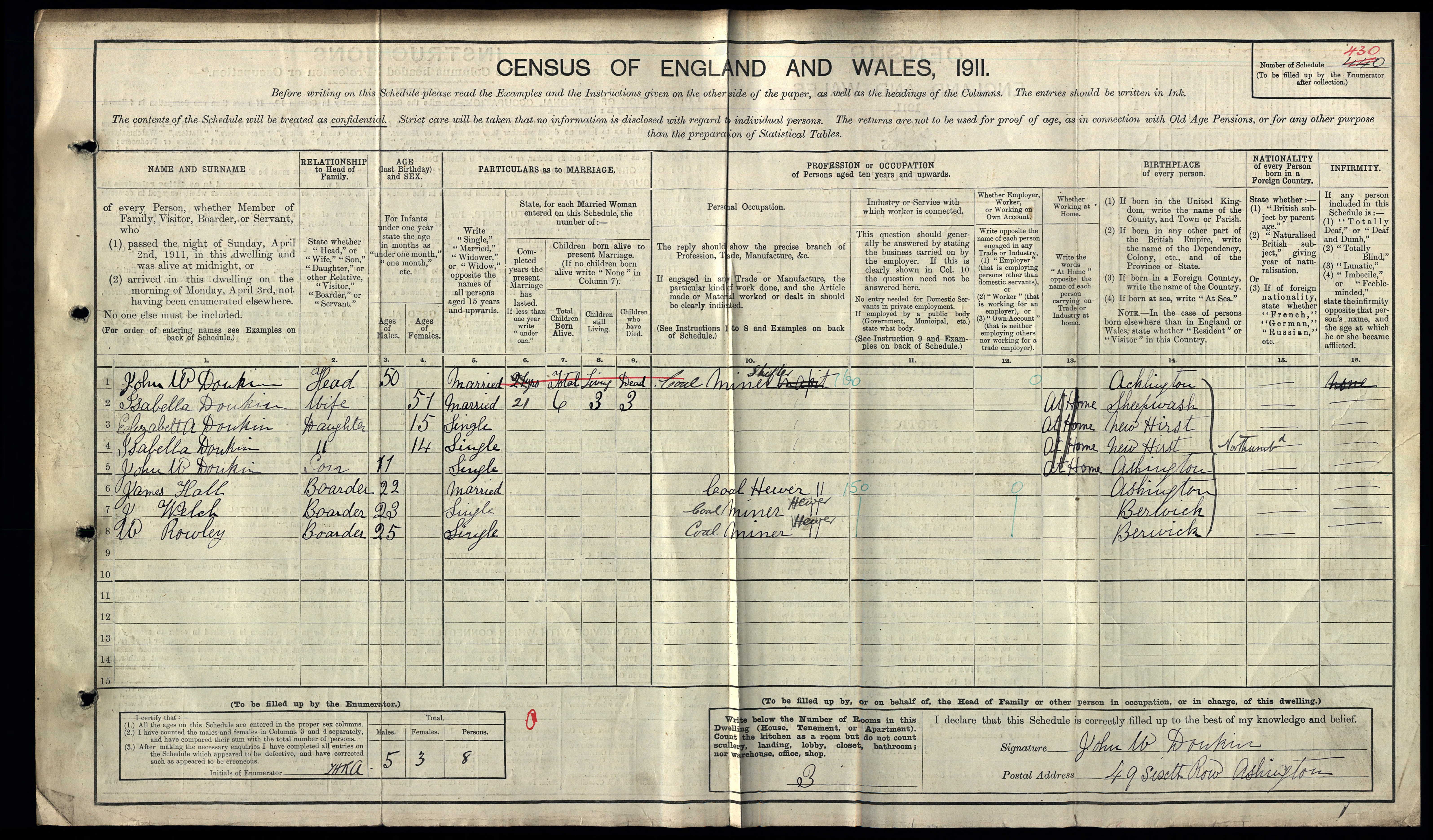 - was recorded in the census on 2 Apr, 1911 at 49 Sixth Row, Ashington, Bothal Demesne, Northumberland, England
