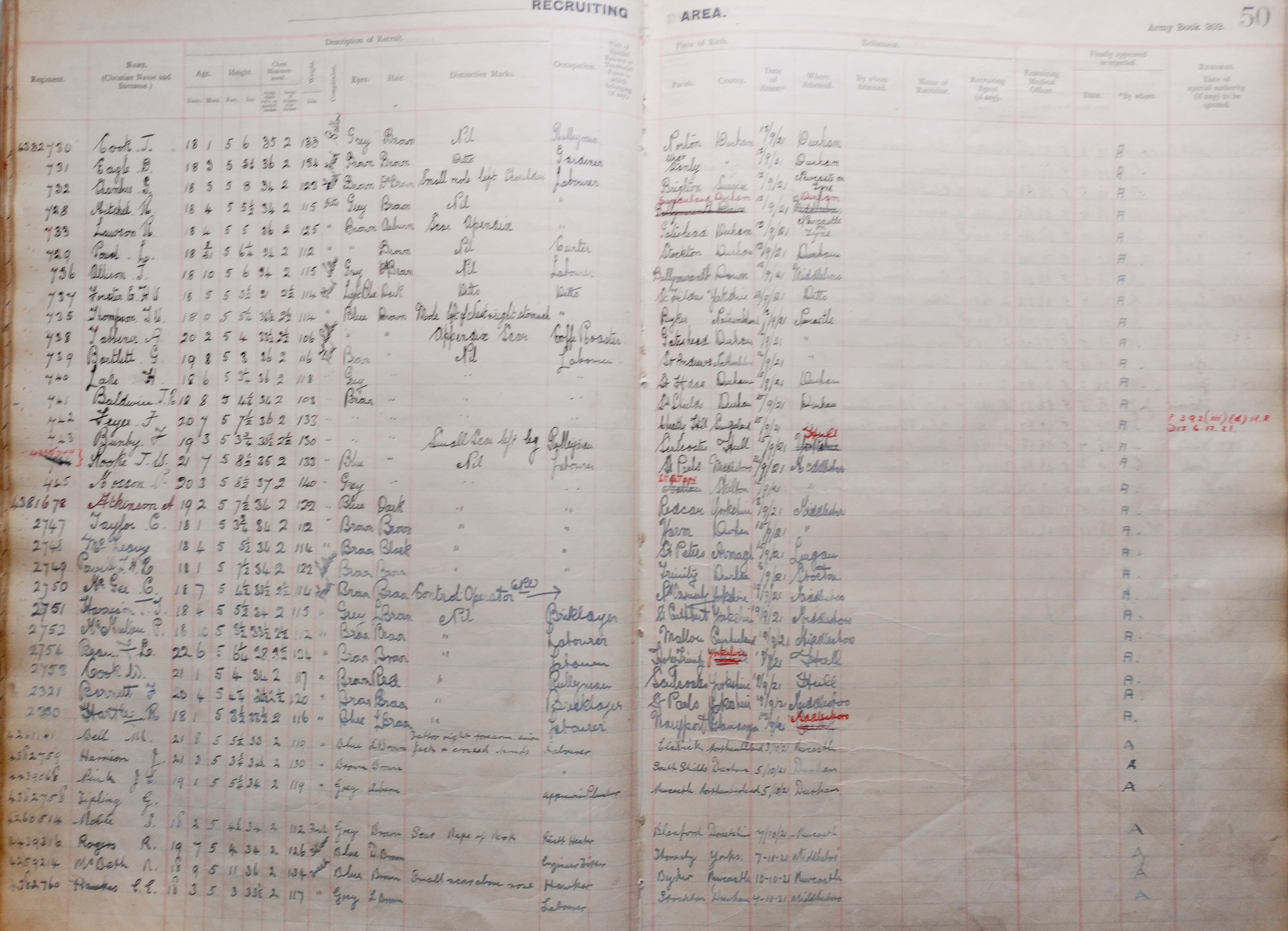 Regiment: 4382732 Name: Chambers G. Age: 18 years 5 months Height: 5 feet 8 inches Chest Measurement: 34 inches, 2 inches range Weight: 123 lbs Complexion: datk Eyes: Brown Hair: Brown Marks: small mole left shoulder Occupation: labourer Place of birth: Brighton, Sussex Date of attesting: 12/9/21 Wehere attested: Newcastle on Tyne