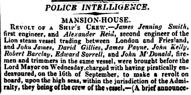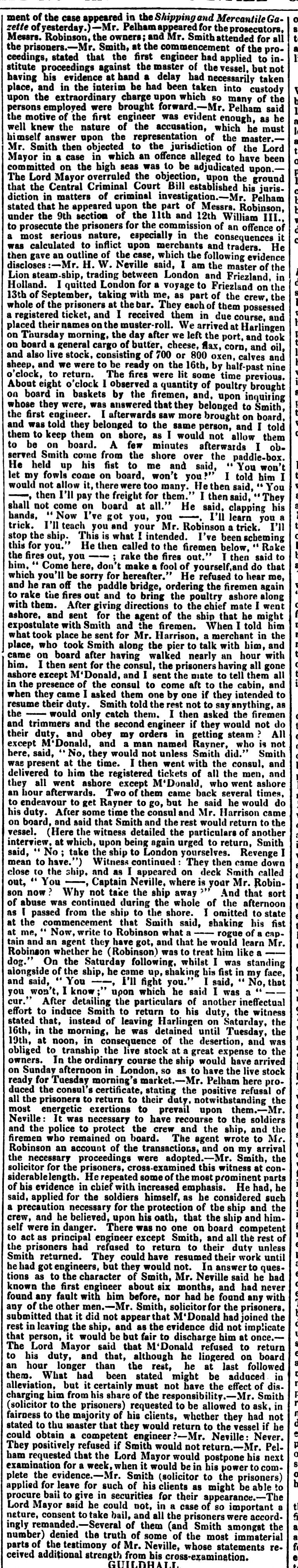 REVOLT OF A SHIP’S CREW. — James Jenning Smith, first engineer, and Alexander Reid, second engineer of the Lion steam vessel trading between London and Friesland, and John James, David Gillies, James Payne, John Kelly, Robert Barclay, Edward Sorrell, and John M’Donald, firemen and trimmers in the same vessel, were brought before the Lord Mayor on Wednesday, charged with having piratically endeavoured, on the 16th of September, to make a revolt on board, upon the high seas, within the jurisdiction of the Admiralty, they being of the crew of the vessel. — (A brief announcement of the case appeared in the Shipping and Mercantile Gazette of yesterday.)-Mr. Pelham sppeared for the prosecutors, Messrs. Robinson, the owners; and Mr. Smith attended for all the prisoners.-Mr. Smith, at the commencement of the proceedings, stated that the first engineer had applied to institute proceedings against the master of the vessel, but not having his evidence at hand a delay had necessarily taken place, and in the interim he had been taken into custody upon the extraordinary charge upon which so many of the persons employed were brought forward. - Mr. Pelham said the motive of the first engineer was evident enough, as he well knew the nature of the accusation, which he must himself answer upon the representation of the master.- Mr. Smith then objected to jurisdiction of the Lord Mayor in a case in which an offence alleged to have been committed on the high seas was to be adjudicated upon.- The Lord Mayor overruled the objection, upon the ground that the Central Criminal Court Bill established his jurisdiction in matters of criminal investigation.-Mr. Pelham stated that he appeared upon the part of Messrs. Robinson, under the 9th section of the 11th and 12th William III., to prosecute the prisoners for the commission of an offence of a most serious nature, especially in the consequences it was calculated to inflict upon merchants and traders. He then gave an outline of the case, which the following evidence discloses:- Mr. H. W. Neville said, I am the master of the Lion steam-ship, trading between London and Friezland, in Holland. I quitted London for a voyage to Friesland on the 13th of September, taking with me, as part of the crew, the crew. whole of the prisoners at the bar. They each of them possessed a registered ticket, and I received them in due course, and placed their names on the muster-roll. We arrived at Harlingen on Thursday morning, the day after we left the port, and took on board a general cargo of butter, cheese, flax, corn, and oil, and also live stock, consisting of 700 or 800 oxen, calves and sheep, and we were to be ready on the 16th, by half-past nine o’clock, to return. The fires were lit some time previous. About eight o’clock I observed a quantity of poultry brought on board in baskets by the firemen, and, upon inquiring whose they were, was answered that they belonged to Smith, the first engineer. I afterwards saw more brought on board, and was told they belonged to the same person, and I told them to keep them on shore, as I would no not allow them to be on board. A few minutes afterwards I observed Smith come from the shore over the paddle-box. He held up his fist to me and said, “You won’t let my fowls come on board, won’t you?” I told him I would not allow it, there were too many. He then said, “You —-, then I’ll pay the freight for them.” I then said, “They shall not come on board at all.” He said, clapping his hands, Now I’ve got you, you —-, I’ll learn you a trick. I’ll teach you and your Mr. Robinson a trick. I’ll stop the ship. This is what I intended. I’ve been scheming this for you." He then called to the firemen below, “Rake the fires out, you —-; rake the fires out.” I then said to him." Come here, don’t make a fool of yourself, and do that which you’ll be sorry for hereafter." He refused to hear me, and he ran off the paddle bridge, ordering the firemen again ering to rake the fires out and to bring the poultry ashore along with them. After giving directions to the chief mate I went ashore, and sent for the agent of the ship that he might expostulate with Smith and the firemen. When I told him what took place be sent for Mr. Harrison, a merchant in the place, who took Smith along the pier to talk with him, and came on board after having walked nearly an hour with him. I then sent for the consul, the prisoners having all gone ashore except M’Donald, and I sent the mate to tell them all in the presence of the consul to come aft to the cabin, and when they came I asked them one by one if they intended to resume their duty. Smith told the rest not to say anything, as the —- would only catch them. I then asked the firemen and trimmers and the second engineer if they would not do their duty, and obey my orders in getting steam? All except M’Donald, and a man named Rayner, who is not here, said, “No, they would not unless Smith did.” Smith was present at the time. I then went with the consul, and delivered to him the registered tickets of all the men, and they all went ashore except M’Donald, who went ashore an hour afterwards. Two of them came back several times, to endeavour to get Rayner to go, but he said he would do his duty. After some time the consul and Mr. Harrison came on board, and said that Smith and the rest would return to the vessel. (Here the witness detailed the particulars of another interview, at which, upon being again urged to return, Smith said, “No: take the ship to to London yourselves. Revenge I mean to have.”) Witness continued: They then came down close to the ship, and as I appeared on deck Smith called out, “You —-, Captain Neville, where is your Mr. Robinson now? Why not take the ship away?” And that sort of abuse was continued during the whole of the afternoon as I passed from the ship to the shore. I omitted to state at the commencement that Smith said, shaking his fi