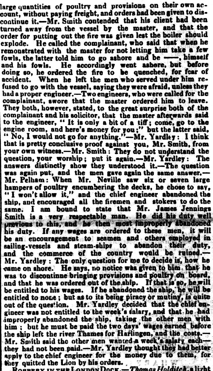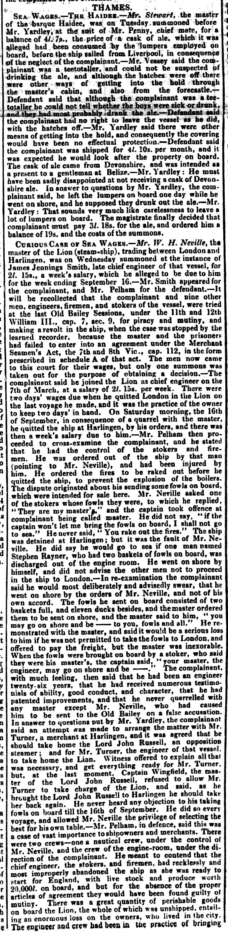 CURIOUS CASE OF SEA WAGES. - Mr. W. H. Neville, the master of the Lion (steam-ship), trading between London and Harlingen, was on Wednesday summoned at the instance of James Jennings Smith, late chief engineer of that vessel, for 21l. 15s., a week's salary, which he alleged to be due to him for the week ending September 16. - Mr. Smith appeared for the complainant, and Mr. Pelham for the defendant. - It will be recollected that the complainant and nine other men, engineers, firemen, and stokers of the vessel, were tried at the last Old Bailey Sessions, under the 11th and 12th William III., cap. 7, sec. 9, for piracy and mutiny, and making a revolt in the ship, when the case was stopped by the learned recorder, because the master and the prisoner had failed to enter into an agreement under the Merchant Seamen's Act, the 7th and 8th Vic., cap. 112, in the form prescribed in schedule A of that act. The men now came to this court for their wages, but only one summons was taken out for the purpose of obtaining a decision. - The complainant had joined the vessel as chief engineer on the 31st of March, at a salary of 21l. 15s. per week. There were two years' wages due when he quitted London the Lion on the 31st of September, and it was the practice of the ship to pay monthly wages in hand. On Saturday morning, the 16th of September, in consequence of a quarrel with the master, while the ship was at Harlingen, by his orders the fires were put out and the ship was left. - Mr. Pelham then proceeded to cross-examine the complainant, and in the statement of the defence, said the captain of the ship had allowed him to bring on board fowls for sale, but the persons who were involved in the shipment took offence at his making too many fowls. He ordered the fires to be raked out before he quitted the ship, to prevent the explosion of the boilers. The dispute originated about his sending some fowls on board, which were intended for sale here. - Mr. Neville asked one of the stokers whose fowls they were, to which he replied, "They are my master's," and the captain took offence at complainant being called a master. He did not say, "if the captain won't let me bring the fowls on board, I shall not go to sea." He never said, "You take out the fires." The ship was detained at Harlingen; but it was the fault of Mr. Neville. He did say he would go to sea if one man named Charles Rayner, who had two baskets of fowls on board, was discharged out of the engine room. He went on shore by himself, and did not advise the other men not to proceed in the ship to London. - In re-examination the complainant said he would most deliberately and advisedly swear, that he went on shore by the orders of Mr. Neville, and not of his own accord. The fowls he sent on board consisted of two baskets full and eleven ducks besides, and the master ordered the voyage to be sent on shore, and the master said to him, "if you won't go on shore and be ---- to you, fowls and all." He refused to go, and the matter, and said it would be a serious loss to the complainant not to take the fowls to London, and complainant took the freight, but the master was inexorable. There was a great quantity of perishable goods on board the Lion, the whole of which was unshipped, entailing an enormous loss on the shippers who lived in the city. The engineer and crew had been in the practice of bringing large quantities of poultry and provisions on their own account, without paying freight, and orders had been given to discontinue it. - Mr. Smith contended that his client had been turned away from the vessel by the master, and that the order for putting out the fire was given lest the boiler should explode. He called the complainant, who said that when he remonstrated with the master for not letting him take a few fowls, the latter told him to go ashore and be ---- himself and his fowls. He accordingly went ashore, but before doing so, he ordered the fire to be quenched, for fear of accident. When he left the men who served under him refused to go with the vessel, saying they were afraid, unless they had a proper engineer. - Two engineers, who were called for the complainant, swore that the master ordered him to leave. They both, however, stated, to the great surprise both of the complainant and his solicitor, that the master afterwards said to the engineer, "It is only a bit of a tiff; come, go to the engine room, and here’s money for you," but the latter said, "No, I would not go for anything." - Mr. Yardley: I think that is pretty conclusive proof against you, Mr. Smith, from your own witness. - Mr. Smith: They do not understand the question, your worship; put it again. - Mr. Yardley: The answers distinctly show they understood it. - The question was again put, and the men gave again the same answer.Mr. Pelham: When Mr. Neville saw six or seven large hampers of poultry encumbering the deck, he chose to say, “I won’t allow it,” and the chief engineer abandoned the ship, and encouraged all the firemen and stokers to do the same. I am bound to state that Mr. James Jennings Smith is a very respectable man. He did his duty. He believed this, and he then most improperly abandoned his duty. If any wages are ordered to these men, it will be an encouragement to seamen and others employed in sailing-vessels and steam-ships to abandon their duty, and the commerce of the country would be ruined. - Mr. Yardley: The only question for me to decide is, how he came on shore. He says, no notice was given to him that he was to discontinue bringing provisions and poultry on board and that he was ordered out of the ship. If that is so, he will be entitled to his wages. If he abandoned the ship, he will be entitled to none; but as to its being piracy or mutiny, it is quite out of the question. Mr. Yardley decided that the chief engineer was not entitled to the week’s salary, and that he had improperly abandoned the ship, taking the other men with him; but he must be pai