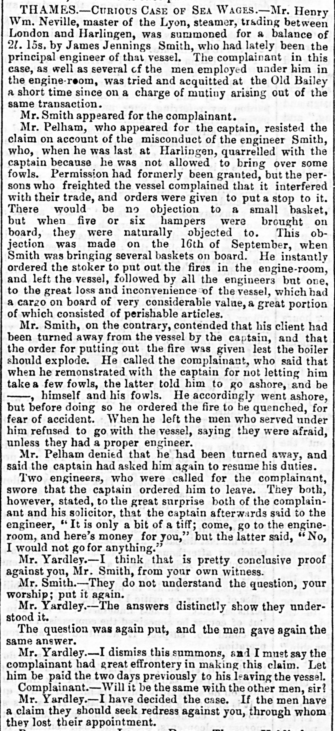 THAMES. - CURIOUS CASE OF SEA WAGES. - Mr. Henry Wm. Neville, master of the Lyon, steamer, trading between London and Harlingen, was summoned for a balance of 2l. 15s. by James Jennings Smith, who had lately been the principal engineer of that vessel. The complainant in this case, as well as several of the men employed under him in the engine-room, was tried and acquitted at the Old Bailey a short time since on a charge of mutiny arising out of the same transaction.Mr. Smith appeared for the complainant.