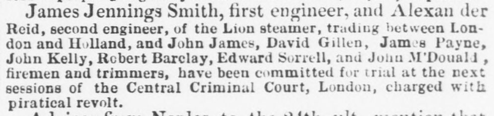 James Jennings Smith, first engineer, and Alexander Reid, second engineer, of the Lion steamer, trading between London and Holland, and John James, David Gillen, James Payne, John Kelly, Robert Barclay, Edward Sorrell, and John M'Donald, firemen and trimmers, have been committed for trial at the next sessions of the Central Criminal Court, London, charged with piratical revolt.