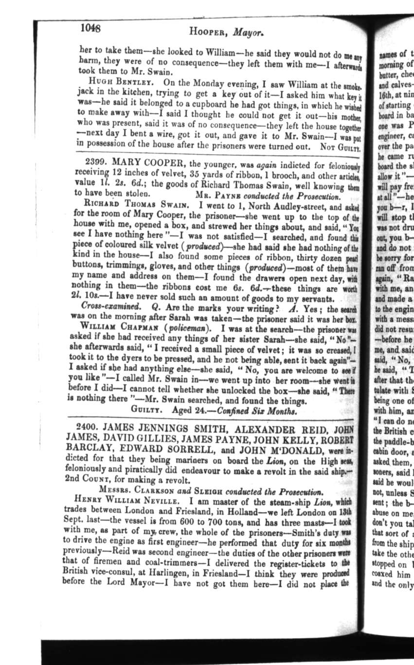 2400. JAMES JENNINGS SMITH, ALEXANDER REID, JOHN JAMES, DAVID GILLIES, JAMES PAYNE, JOHN KELLY, ROBERT BARCLAY, EDWARD SORRELL , and JOHN MCDONALD , were indicted for that they being mariners on board the Lion, on the High seas, feloniously and piratically did endeavour to make a revolt in the said ship.—2nd COUNT, for making a revolt.MESSRS. CLARKSON and SLEIGH conducted the Prosecution.
