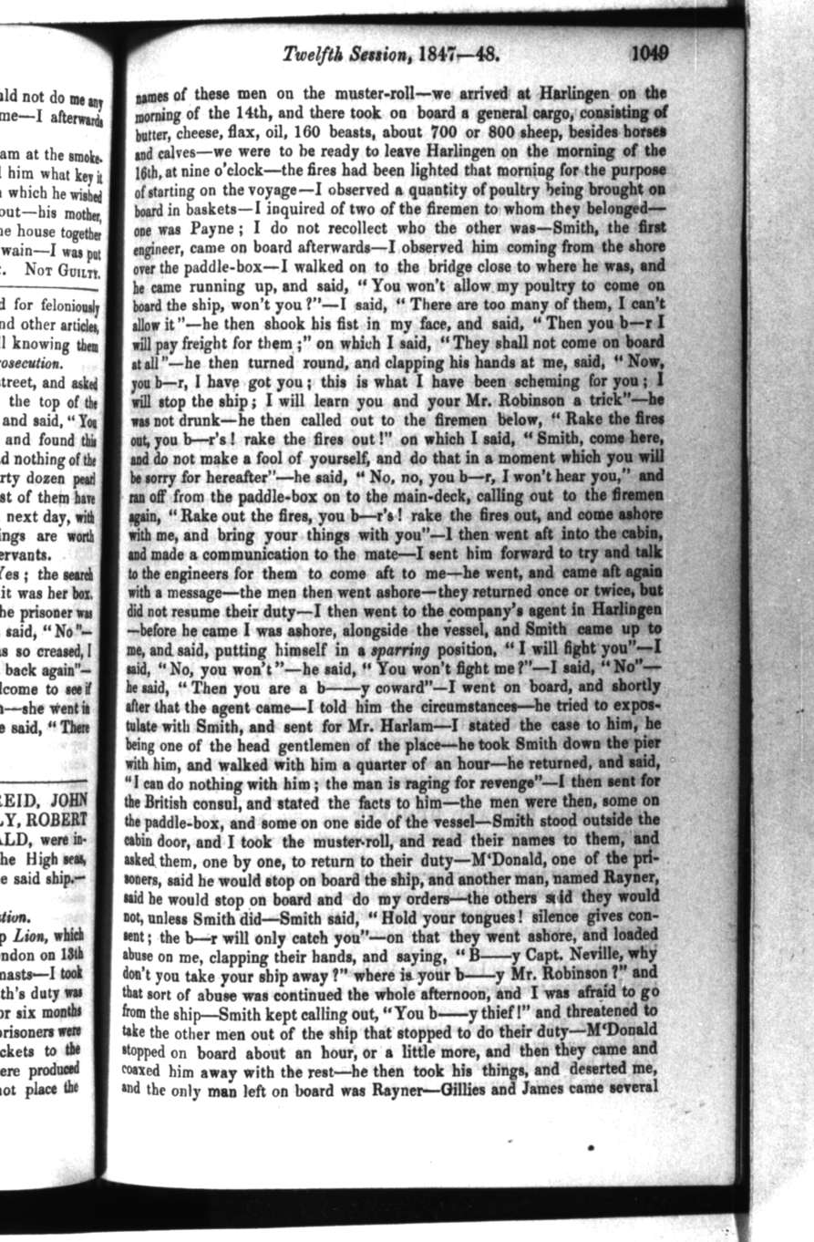 HENRY WILLIAM NEVILLE . I am master of the steam-ship Lion, which trades between London and Friesland, in Holland—we left London on 13th Sept. last—the vessel is from 600 to 700 tons, and has three masts—I took with me, as part of my crew, the whole of the prisoners—Smith’s duty was to drive the engine as first engineer—he performed that duty for six months previously—Reid was second engineer—the duties of the other prisoners were that of firemen and coal-trimmers—I delivered the register-tickets to the British vice-consul, at Harlingen, in Friesland—I think they were produced before the Lord Mayor—I have not got them here—I did not place the names of these men on the muster-roll—we arrived at Harlingen on the morning of the 14th, and there took on board a general cargo, consisting of butter, cheese, flax, oil, 160 beasts, about 700 or 800 sheep, besides horses and calves—we were to be ready to leave Harlingen on the morning of the 16th, at nine o’clock—the fires had been lighted that morning for the purpose of starting on the voyage—I observed a quantity of poultry being brought on board in baskets—I inquired of two of the firemen to whom they belonged—one was Payne; I do not recollect who the other was—Smith, the first engineer, came on board afterwards—I observed him coming from the shore over the paddle-box—I walked on to the bridge close to where he was, and he came running up, and said, “You won’t allow my poultry to come on board the ship, won’t you?"—I said, “There are too many of them, I can’t allow it”—he then shook his fist in my face, and said, “Then you b—r I will pay freight for them;” on which I said, “They shall not come on board at all”—he then turned round, and clapping his hands at me, said, “Now, you b—r, I have got you; this is what I have been scheming for you; I will stop the ship; I will learn you and your Mr. Robinson a trick”—he was not drunk—he then called out to the firemen below, “Rake the fires out, you b—r’s! rake the fires out!” on which I said, “Smith, come here, and do not make a fool of yourself, and do that in a moment which you will be sorry for hereafter”—he said, “No, no, you b—r, I won’t hear you,” and ran off from the paddle-box on to the main-deck, calling out to the firemen again, “Rake out the fires, you b—r’s! rake the fires out, and come ashore with me, and bring your things with you”—I then went aft into the cabin, and made a communication to the mate—I sent him forward to try and talk to the engineers for them to come aft to me—he went, and came aft again with a message—the men then went ashore—they returned once or twice, but did not resume their duty—I then went to the company’s agent in Harlingen—before be came I was ashore, alongside the vessel, and Smith came up to me, and said, putting himself in a sparring position, “I will fight you”—I said, “No, you won’t”—he said, “You won’t fight me?"—I said, “No”—he said, “Then you are a b—-y coward”—I went on board, and shortly after that the agent came—I told him the circumstances—he tried to expostulate with Smith, and sent for Mr. Harlam—I stated the case to him, he being one of the head gentlemen of the place—he took Smith down the pier with him, and walked with him a quarter of an hour—he returned, and said, “I can do nothing with him; the man is raging for revenge”—I then sent for the British consul, and stated the facts to him—the men were then, some on the paddle-box, and some on one side of the vessel—Smith stood outside the cabin door, and I took the muster-roll, and read their names to them, and asked them, one by one, to return to their duty—M’Donald, one of the prisoners, said he would stop on board the ship, and another man, named Rayner, said he would stop on board and do my orders—the others said they would not, unless Smith did—Smith said, “Hold your tongues! silence gives consent; the b—r will only catch you”—on that they went ashore, and loaded abuse on me, clapping their hands, and saying, “B—-y Capt. Neville, why don’t you take your ship away?” where is your b—-y Mr. Robinson I and that sort of abuse was continued the whole afternoon, and I was afraid to go from the ship—Smith kept calling out, “You b—-y thief!” and threatened to take the other men out of the ship that stopped to do their duty—M’Donald stopped on board about an hour, or a little more, and then they came and coaxed him away with the rest—he then took his things, and deserted me, and the only man left on board was Rayner—Gillies and James came several times to try and get him, and threatened they would murder him if he remained in the ship—I delivered the whole of their register-tickets to the British consul—about eleven o’clock he came, and said, “I think Smith will return now with the rest”—he did not return nor did any of them—I at last got a fresh crew—I had to hire another steamer, and leave that port for Amsterdam, expecting to meet a ship there belonging to the same company, but she—had sailed the night before—I left at eight on the Saturday evening after having three interviews with the prisoners to see whether they would come or—I arrived at Amsterdam at five the next afternoon, and had to wait till five on Monday afternoon, and hire another steam-boat to convey me and an engineer back to Harlingen, to bring my cargo to London—the cargo was transhipped; the live-stock were obliged to be put into stalls or fields, and be kept at an expense to the owners till we started, and instead of my leaving Harlingen on the 16th, as I ought to have done, I was not able to leave till the 19th, and did not arrive here till the 20th; and according to the average passage I ought to have arrived on the Sunday afternoon, so as to enable the cattle and other goods to be at the