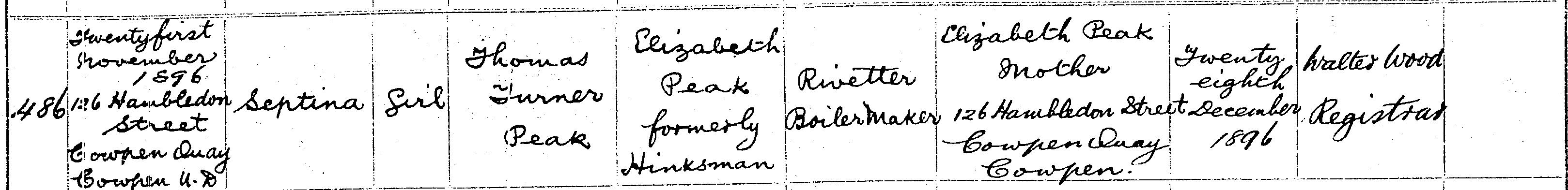 Birth in the Registration District of Tynemouth, Northumberland, 1896, no. 486. Born 21 Nov 1896 at 126 Hambledon Street, Cowpen Quay, Cowpen; Septina Peak; Girl; father Thomas Turner Peak; mother Elizabeth Peak formerly Hinksman. Occupation of father: Rivetter Boilermaker. Informant was Elizabeth Peak; Mother; 126 Hambledon Street, Cowpen Quay, Cowpen; signed name. The birth was registered 28 Dec 1896.