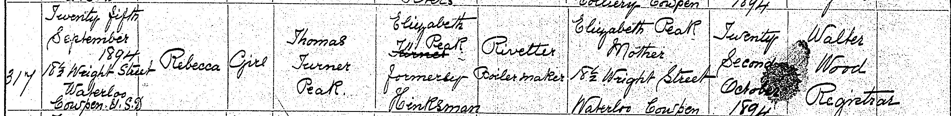 Birth in the Registration District of Tynemouth, Northumberland, 1894, no. 317. Born 25 Sep 1894 at 18½ Wright Street, Waterloo, Cowpen; Rebecca Peak; Girl; father Thomas Turner Peak; mother Elizabeth Peak formerly Hinksman. Occupation of father: Rivetter Boilermaker. Informant was Elizabeth Peak; Mother; 18½ Wright Street, Waterloo, Cowpen; signed name. The birth was registered 22 Oct 1894.