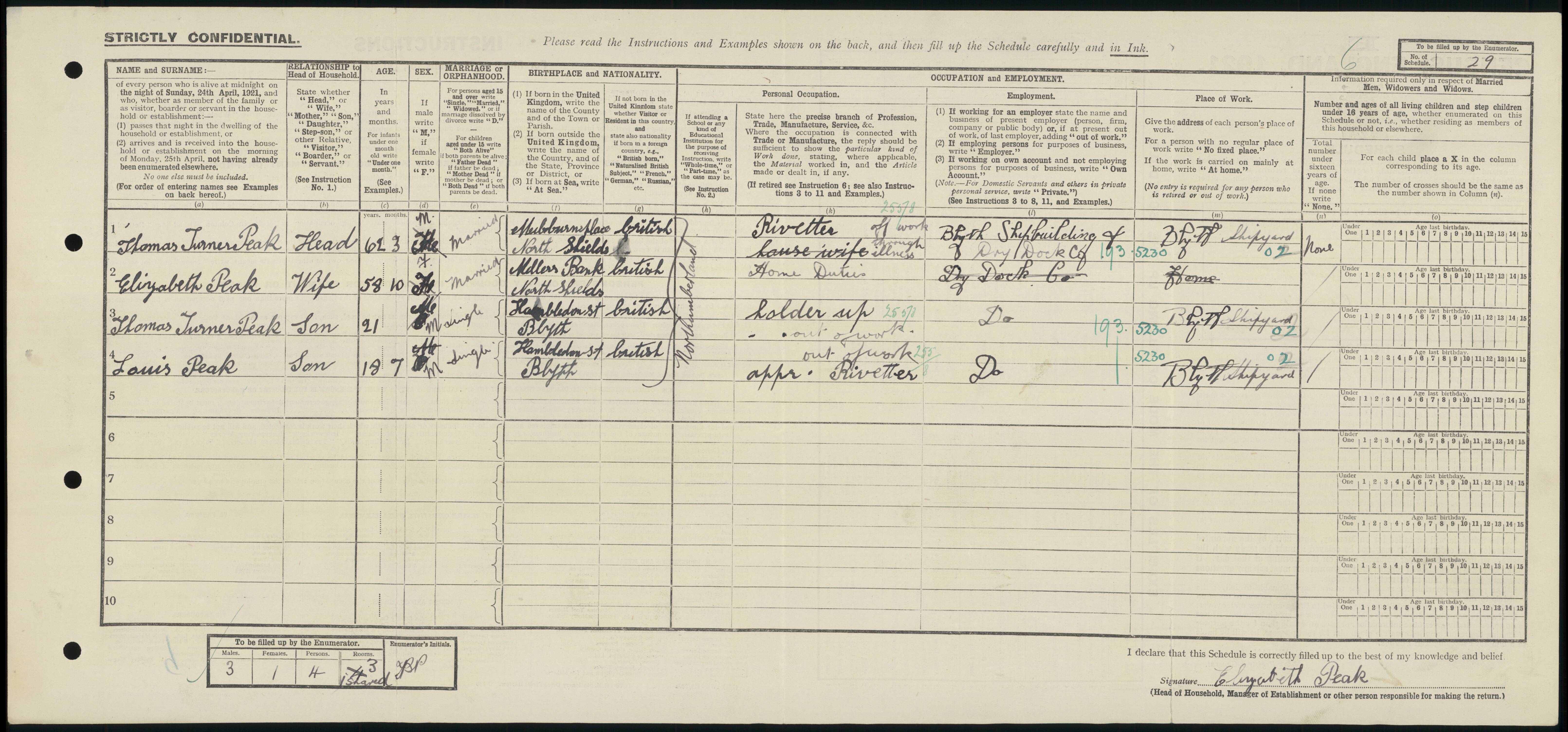 - Thomas Turner Peak★ had occupation recorded as rivetter on 19 Jun, 1921 at Blyth Shipyard, Blyth, Northumberland, England