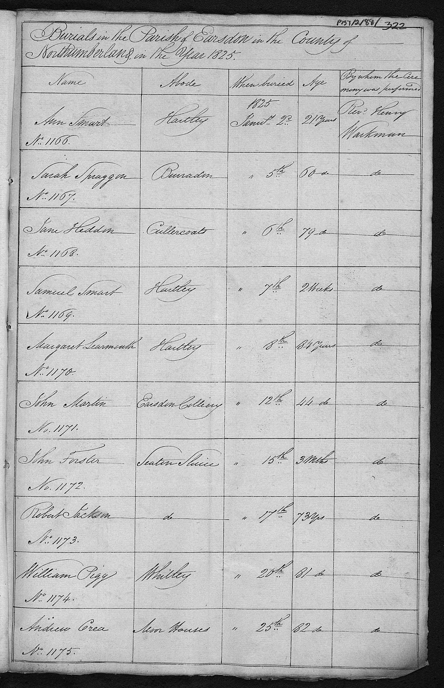 Bishop's Transcripts for the Diocese of Durham, England; Burial entry for Margaret Learmouth, Earsdon, 8 Jan 1825, No 1170.