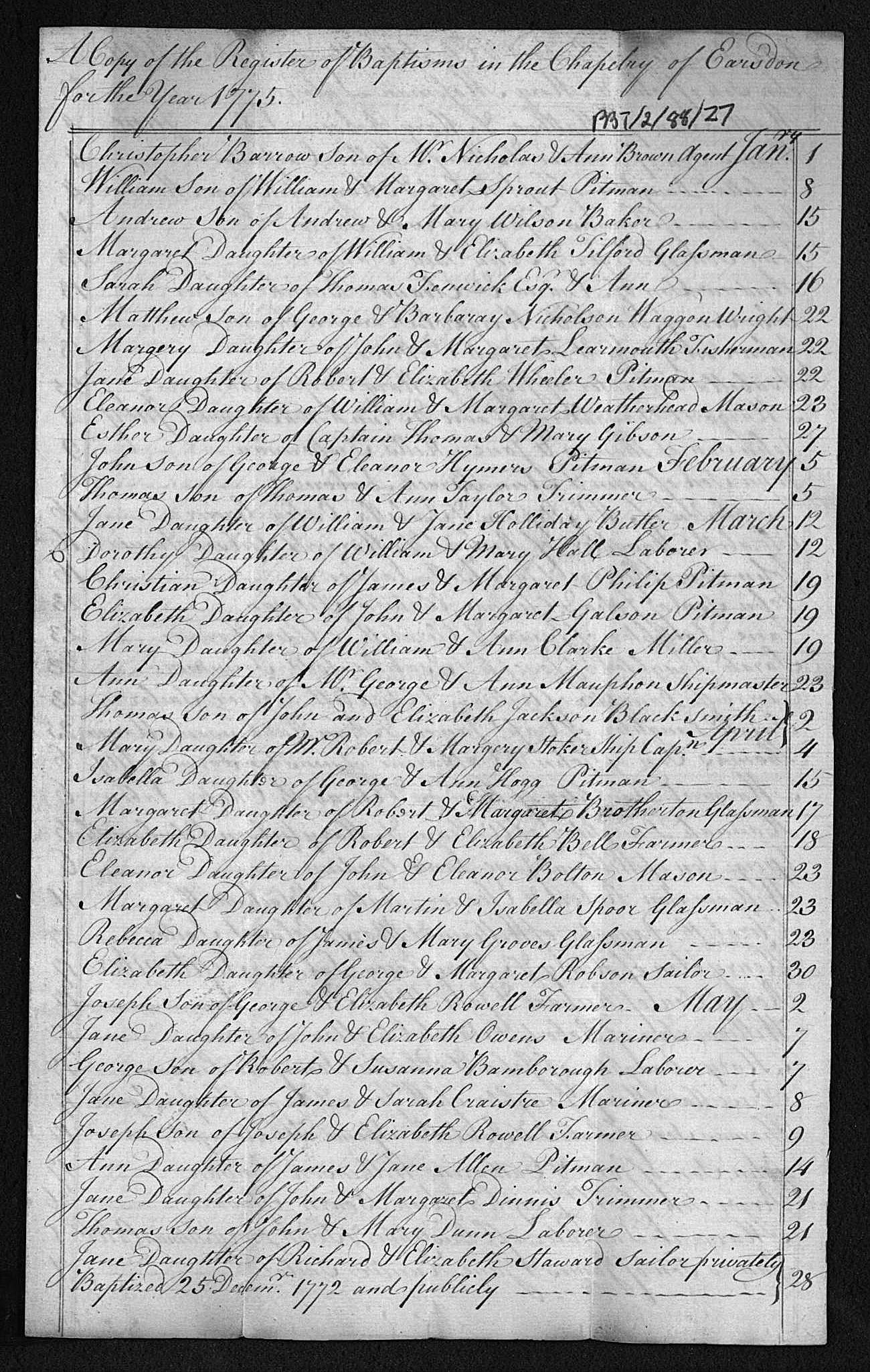 Bishop's Transcripts for the Diocese of Durham, England; Baptism entry for Margery Learmouth, Earsdon, 22 Jan 1775.