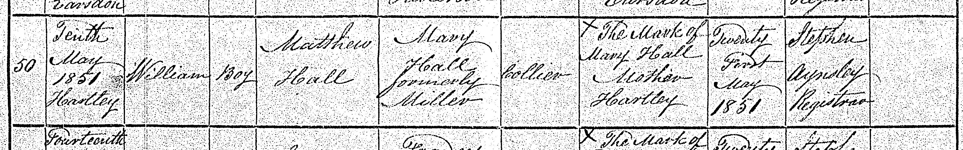 Birth in the Registration District of Tynemouth, Northumberland, 1851, no. 50. Born 10 May 1851 at Hartley; William Hall; Boy; father Matthew Hall; mother Mary Hall formerly Miller. Occupation of father: Collier. Informant was Mary Hall; Mother; Hartley; could not sign name. The birth was registered 21 May 1851.