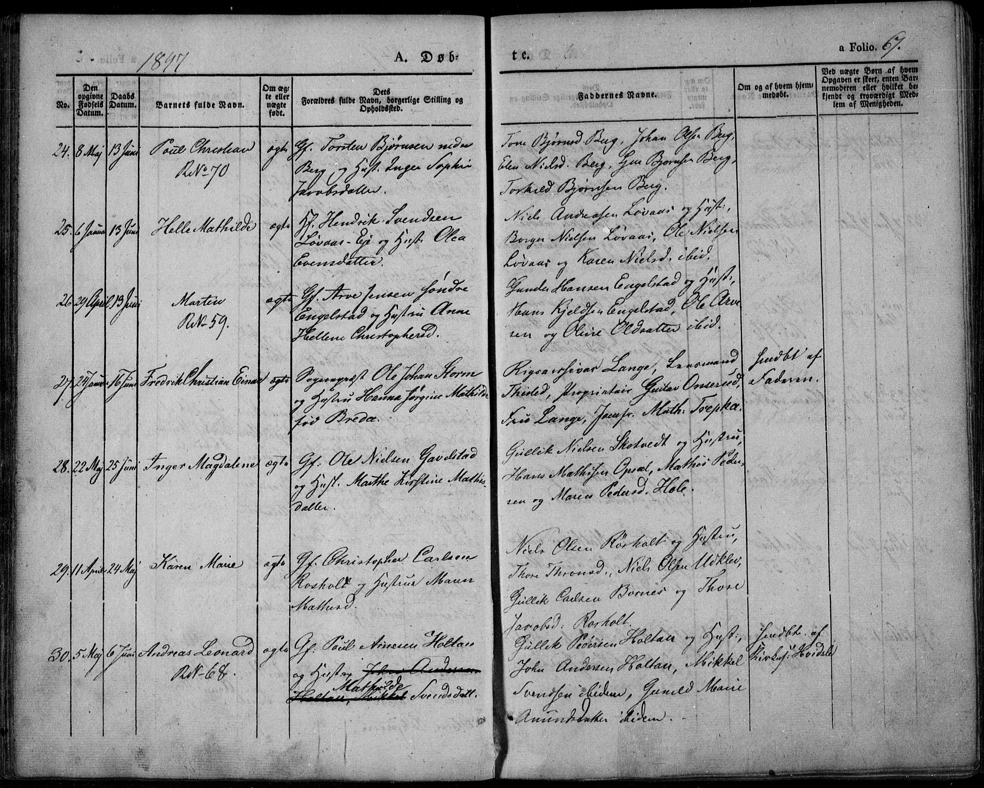 Baptism entry for Martin, 13 Jun 1847, Lardal, AV/SAKO-A-350/F/Fa/L0006 (Ministerialbok nr. I 6, 1835-1860), Page 67, Number 26