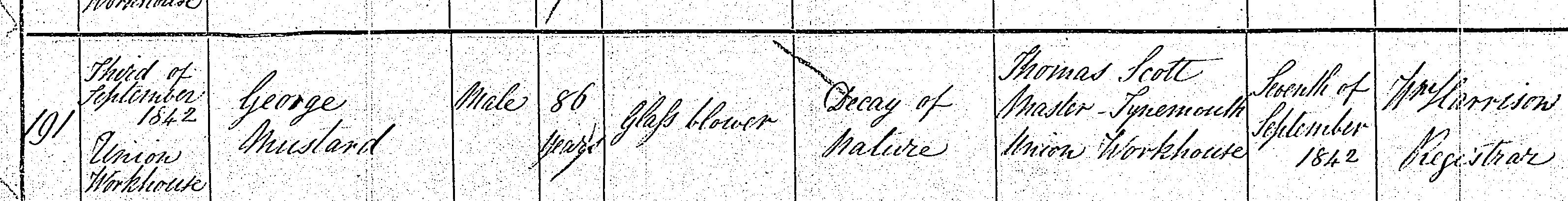 Death in the Registration District of Tynemouth, Northumberland, 1842, no. 181. Died 3 Sep 1842 at Union Workhouse; George Mustard; Male; age 86; Glass Blower. Cause of death: Decay of Nature. Informant was Thomas Scott (signed name); relation: Master of Workhouse; residing at Tynemouth Union Workhouse. The death was registered 7 Sep 1842.