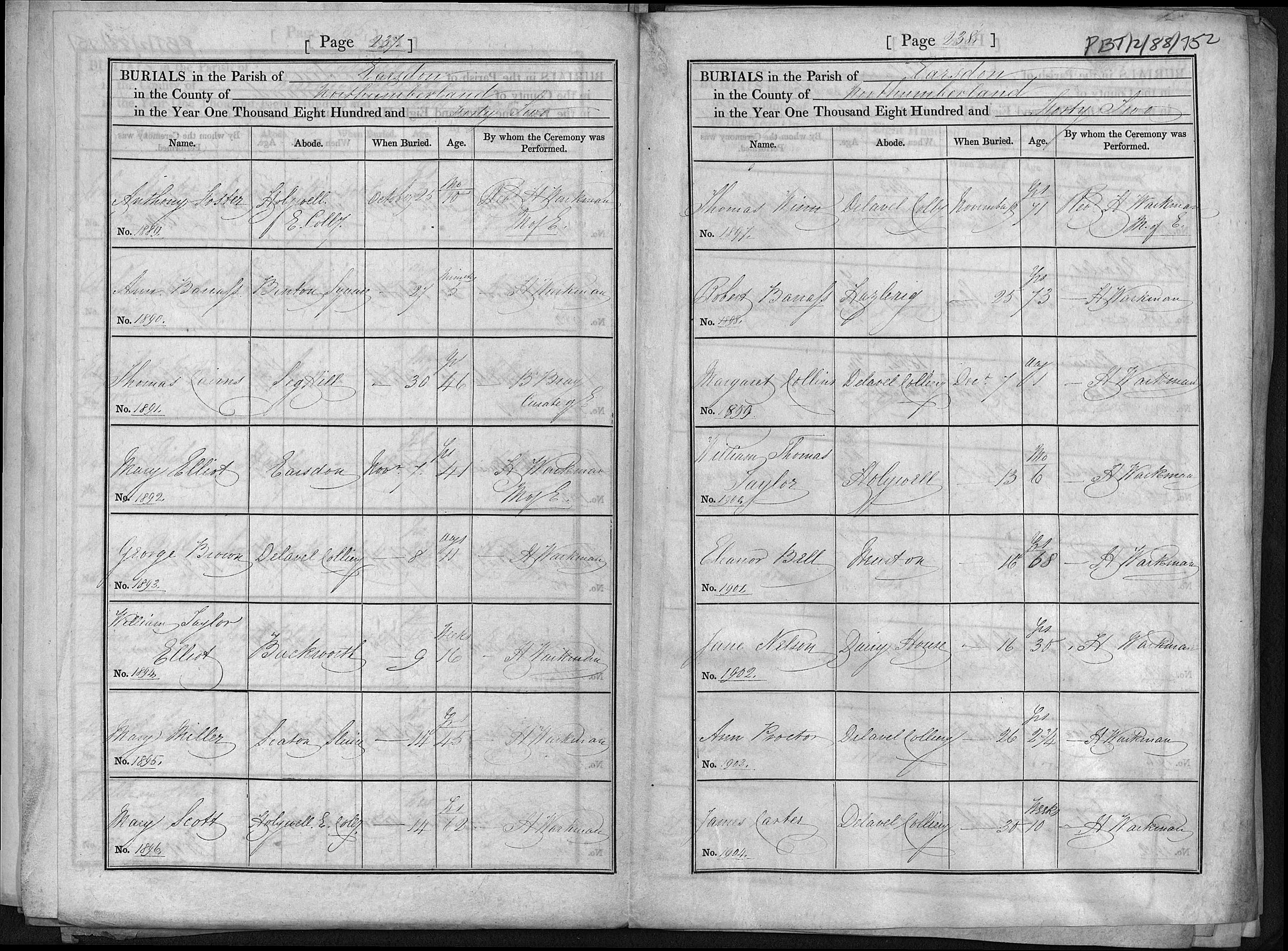 Bishop's Transcripts for the Diocese of Durham, England; Burial entry for Mary Miller, Earsdon, 14 Nov 1842, Page 237, No 1895.