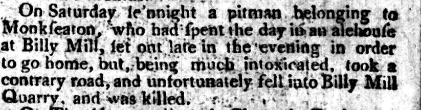 On Saturday night, a pitman belonging to Monkseaton, who had spend the day in an alehouse at Billy Mill, set out late in the evening in order to go home but, being much intoxicated, took a contrary road and unfortunately fell into Billy Mill Quarry and was killed.