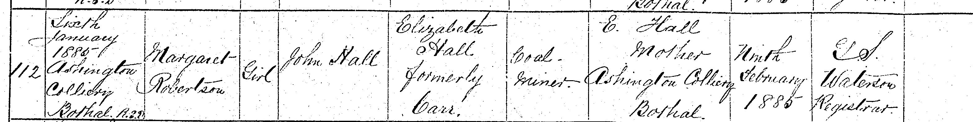 Birth in the Registration District of Morpeth, Northumberland, 1995, no. 112. Born 6 Jan 1885 at Ashington Colliery, Bothal; Margaret Robertson Hall; Girl; father John Hall; mother Elizabeth Hall formerly Carr. Occupation of father: Coal Miner. Informant was E. Hall; Mother; Ashington Colliery, Bothal; signed name. The birth was registered 9 Feb 1885.