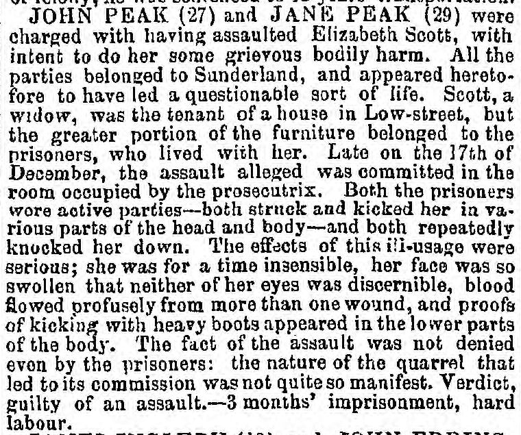 JOHN PEAK (27) and JANE PEAK (29) were charged with having assaulted Elizabeth Scott, with intent to do her some grievous bodily harm. All the parties belonged to Sunderland, and appeared heretofore to have led a questionable sort of life. Scott, a widow, was the tenant of a house in Low-street, but the greater portion of the furniture belonged to the prisoners, who lived with her. Late on the 17th of December, the assault alleged was committed in the room occupied by the prosecutrix. Both the prisoners were active parties—both struck and kicked her in various parts of the head and body—and both repeatedly knocked her down. The effects of this ill-usage were serious; she was for a time insensible, her face was so swollen that neither of her eyes was discernible, blood flowed profusely from more than one wound, and proofs of kicking with heavy boots appeared in the lower parts of the body. The fact of the assault was not denied even by the prisoners; the nature of the quarrel that led to its commission was not quite so manifest. Verdict, guilty of an assault.—3 months' imprisonment, hard labour.