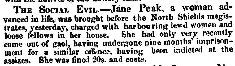 THE SOCIAL EVIL - Jane Peak, a woman advanced in life, was brought before the North Shields magistrates yesterday, charged with harbouring lewd women and loose fellows in her house. She had only very recently come out of gaol, having undergone nine months' imprisonment for a similar offence, having been indicted at the assizes. She was fined 20s and costs.