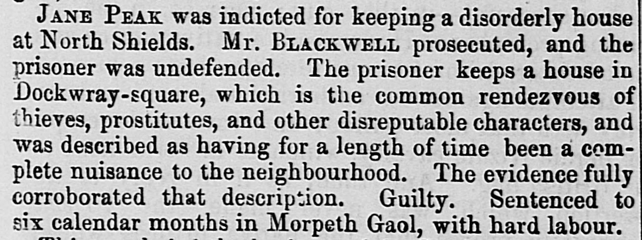 JANE PEAK was indicted for keeping a disorderly house at North Shields. Mr BLACKWELL prosecuted, and the prisoner was undefended. The prisoner keeps a house in Dockwray-square, which is the common rendezvous of thieves, prostitutes, and other disreputable characters, and was described as having for a length of time been a complete nuisance to the neighbourhood. The evidence fully corroborated that description. Guilty. Sentenced to six calendar months in Morpeth Gaol, with hard labour.