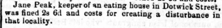 Jane Peak, keeper of an eating house in Dotwick Street, was fined 2s 6d and costs for creating a disturbance in that locality.