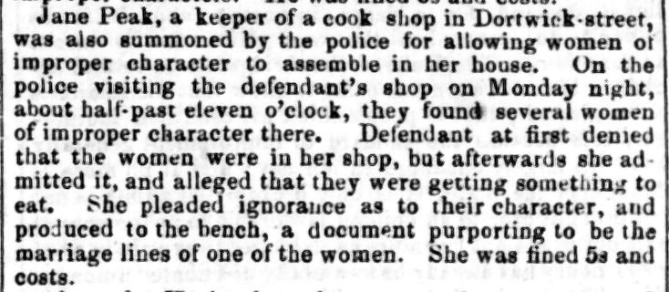 Jane Peak, a keeper of a cook shop in Dortwick-street, was also summmoned by the police for allowing women of improper character to assemble in her house. On the police visiting the defendant's shop on Monday night about half-past eleven o'clock, they found several women of improper character there. Defendant at first denied that the women were in her shop, but afterwards she admitted it, and alleged that they were getting something to eat. She pleaded ignorance as to their character, and produced to the bench, a document purporting to be the marriage lines of one of the women. She was fined 5s and costs.