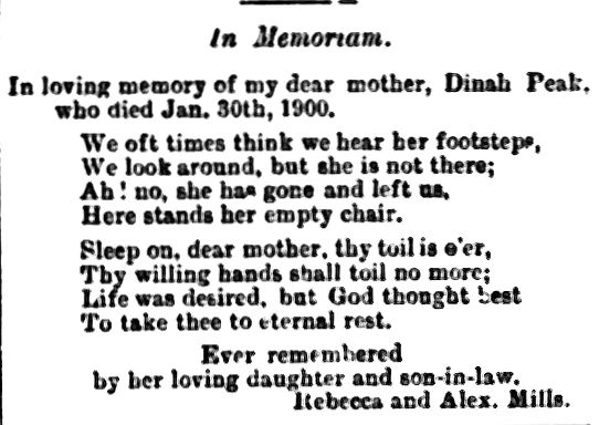 In MemoriamIn loving memory of my dear mother, Dinah Peak, who died Jan 30th, 1900.