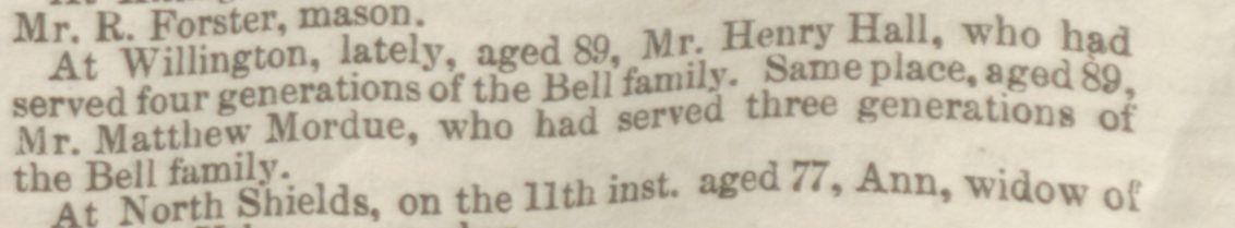 At Willington, lately, aged 89, Mr Henry Hall, who had served four generations of the Bell family. Same place, aged 89, Mr Matthew Mordue, who had served three generations of the Bell family.