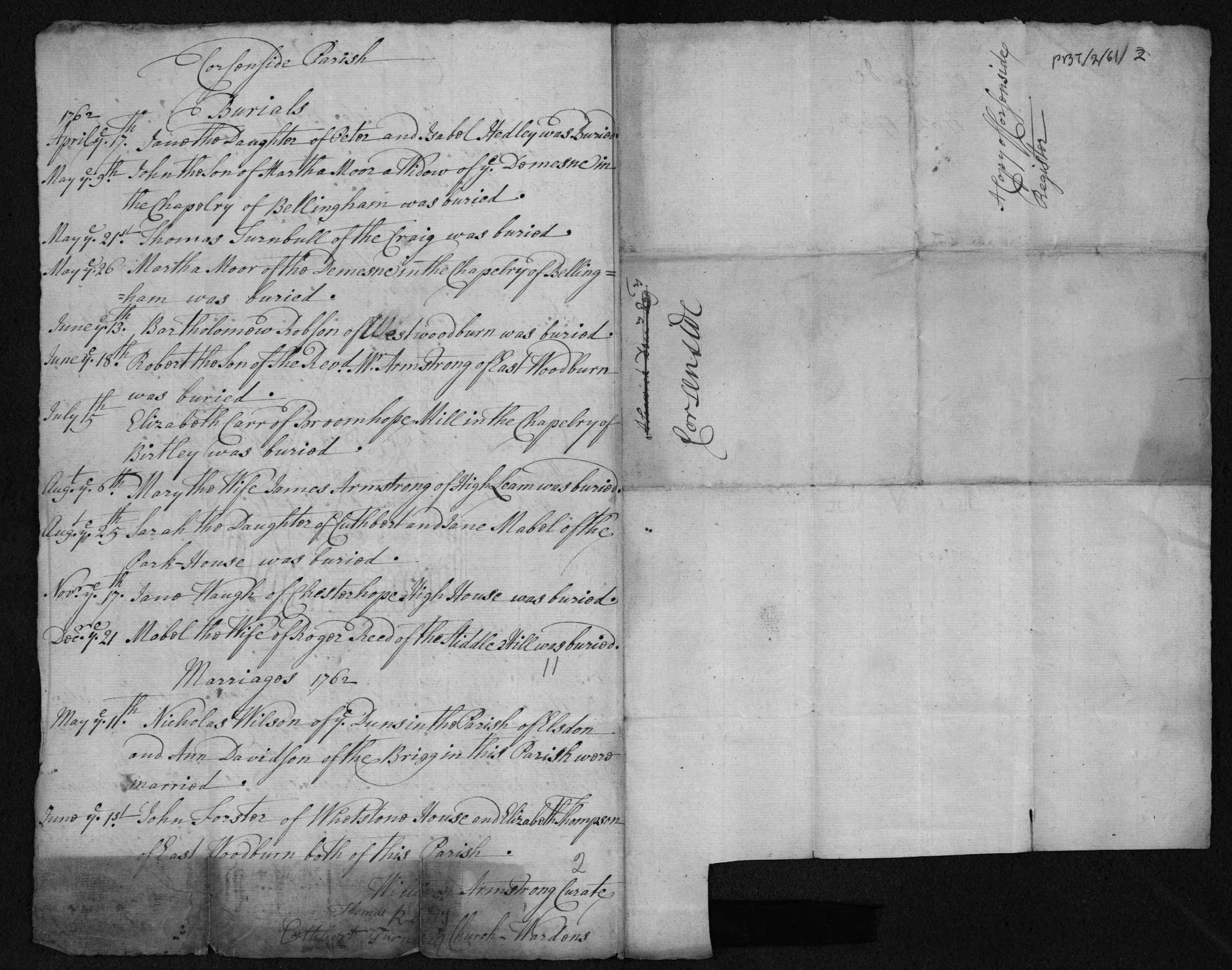 Bishop's Transcripts for the Diocese of Durham, England; Marriage entry for Nicholas Wilson and Ann Davidson, Corsenside, 11 May 1762.