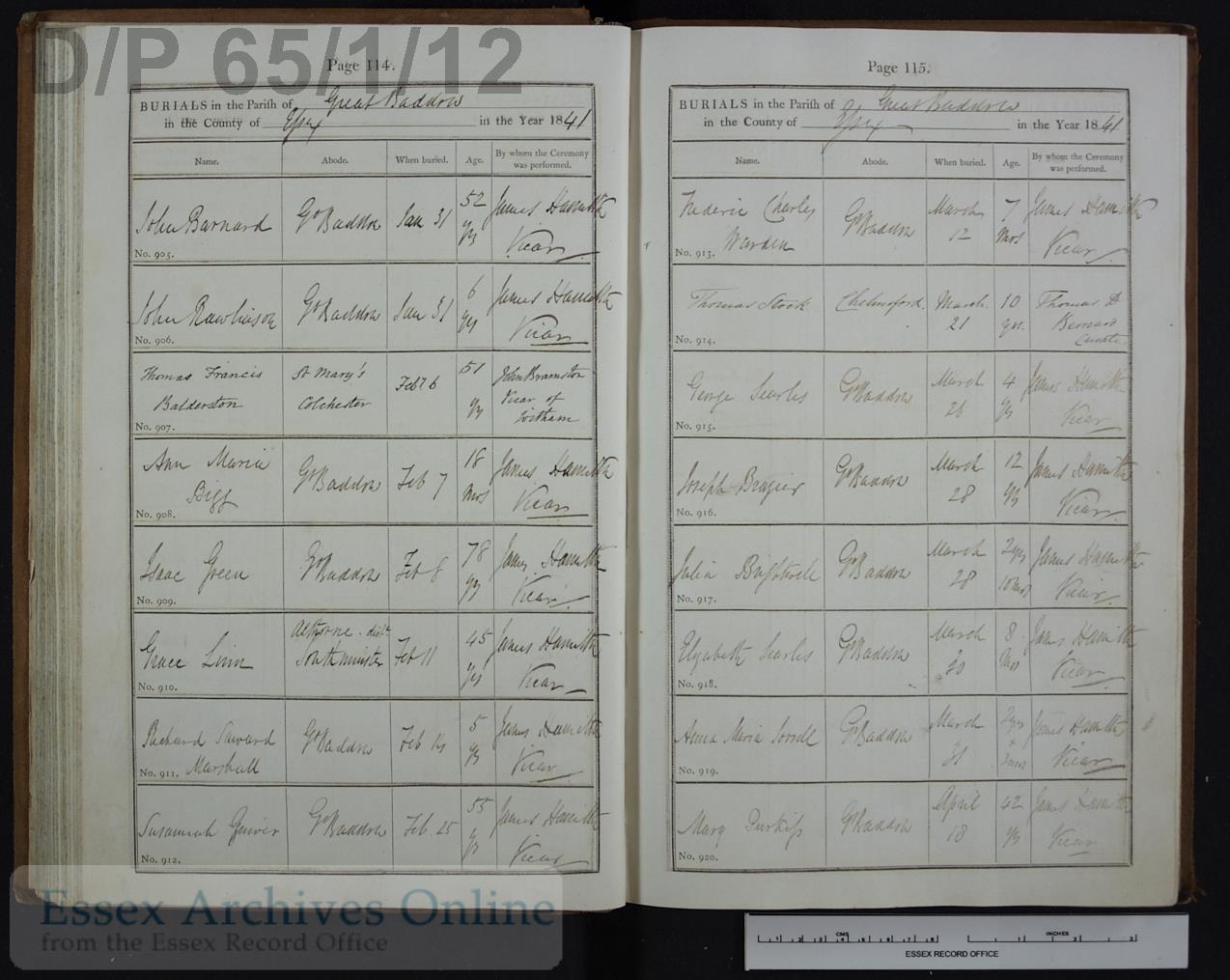 Parish Registers of St. Mary the Virgin, Great Baddow, Essex; Burial entry for Susannah Guiver, 25 Feb 1841, Page 114, No 912.