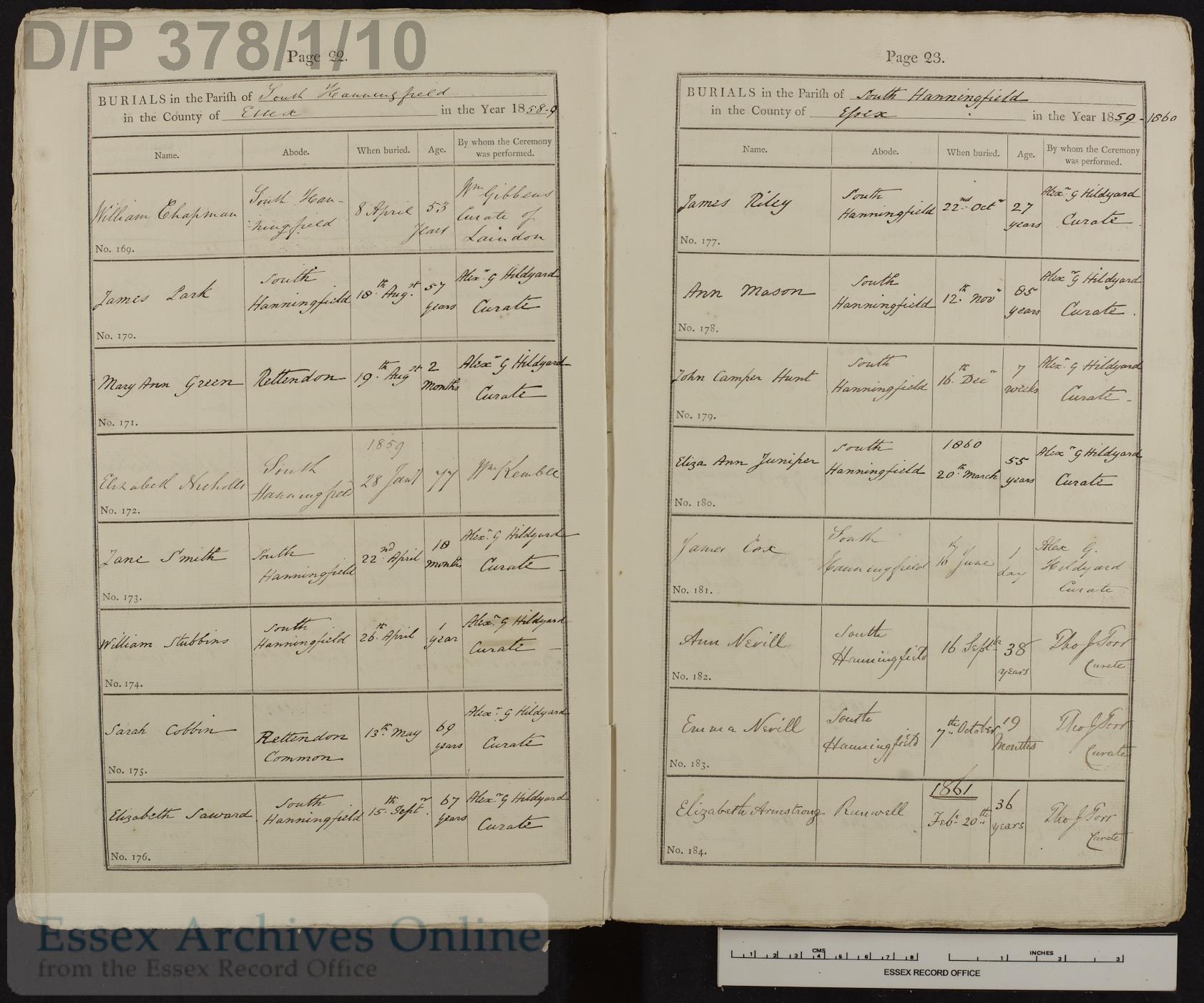 Parish Registers of St. Peter, South Hanningfield, Essex, England; Burial entry for Elizabeth Saward, 15 Sep 1859, Page 22, No 176.