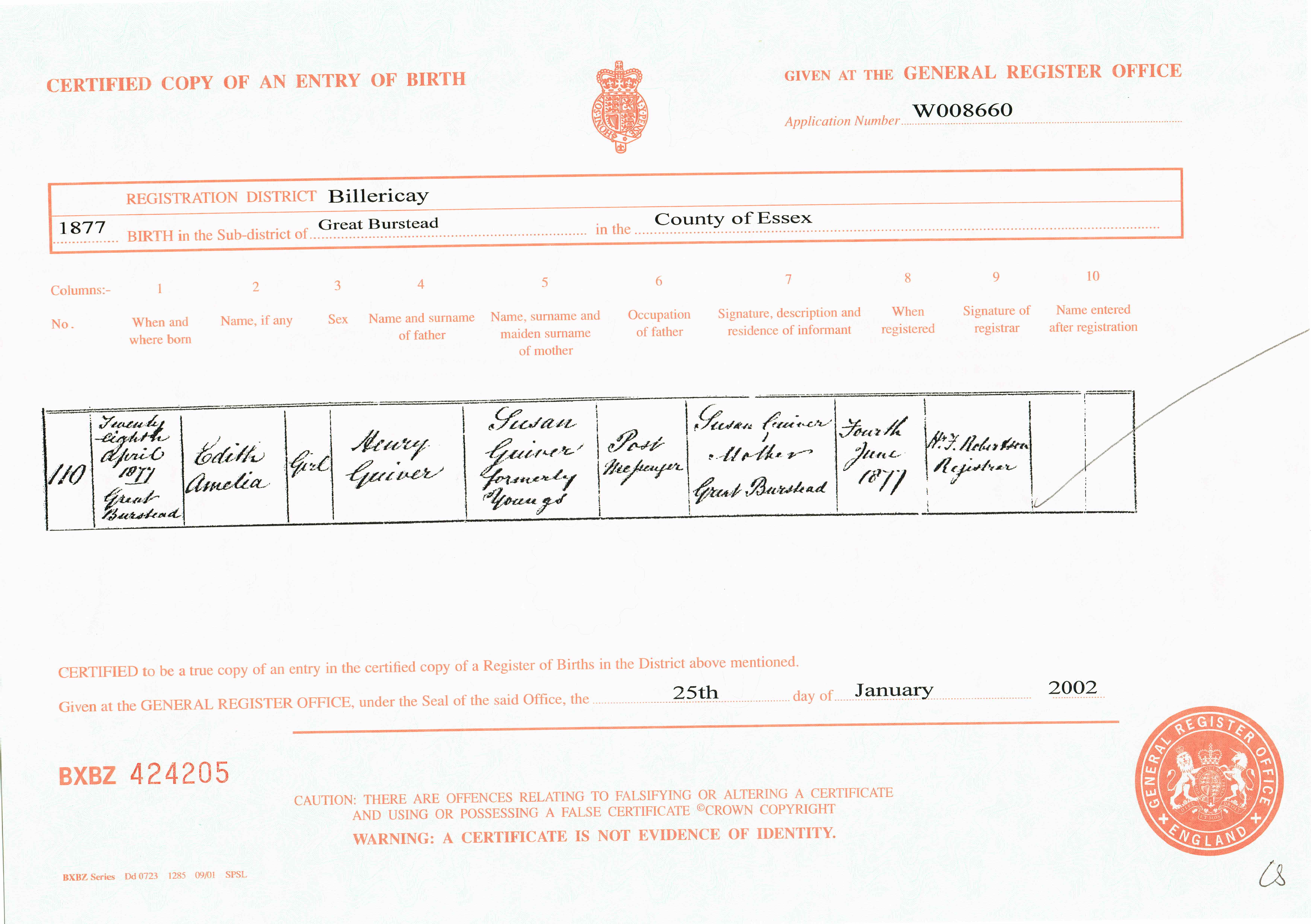 Birth in the Registration District of Billericay, Sub-district of Great Burstead, Essex, 1877, no. 110. Born 28 Apr 1877 at Great Burstead; Edith Amelia Guiver; Girl; father Henry Guiver; mother Susan Guiver formerly Youngs. Occupation of father: Post messenger. Informant was Susan Guiver; Mother; Great Burstead; signed name. The birth was registered 4 Jun 1877.