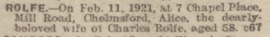 ROLFE - On Feb 11, 1921, at 7 Chapel Place, Mill Road, Chelmsford, Alice the dearly beloved wife of Charles Rolfe, aged 58. c67